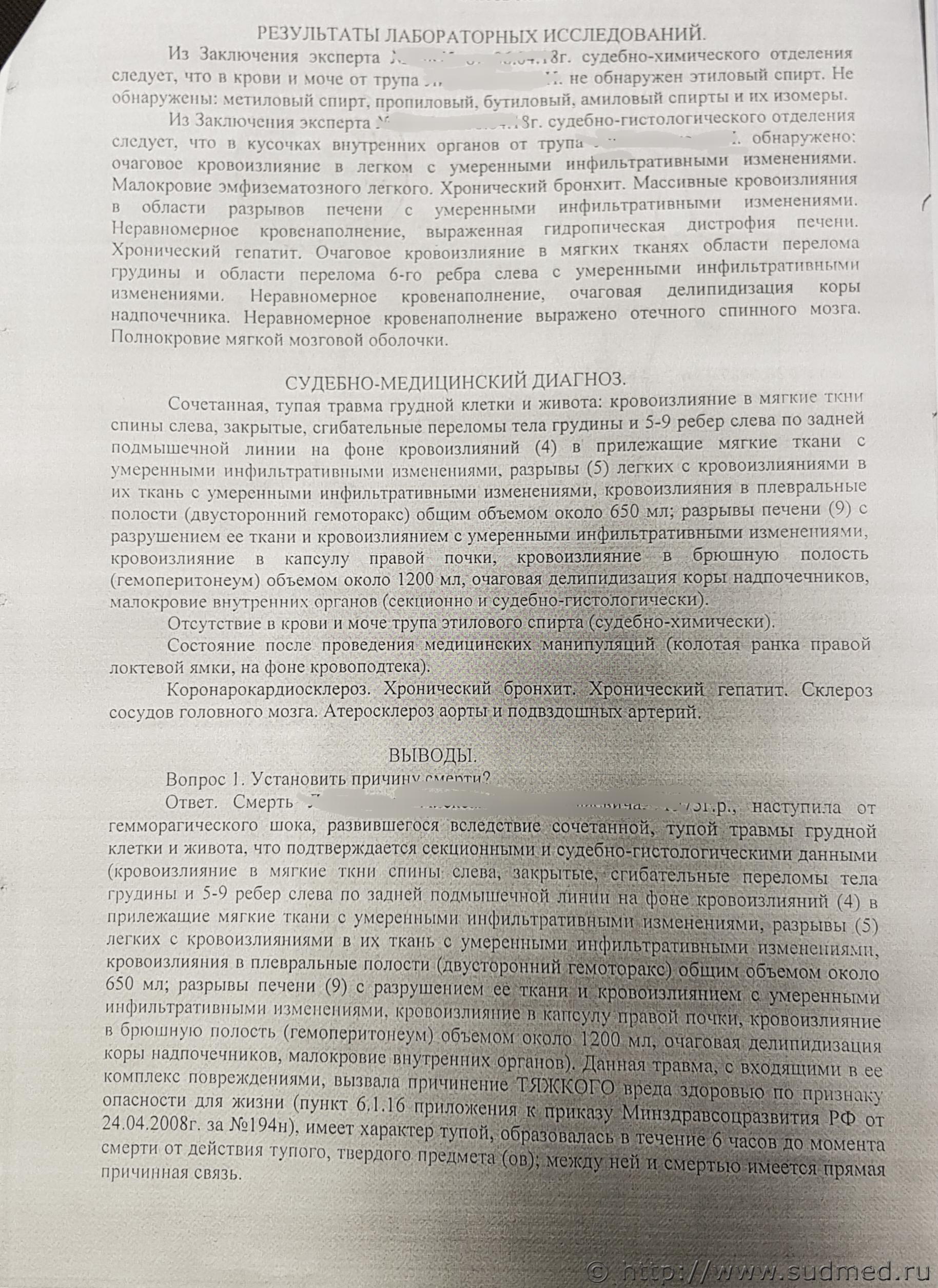 Травма могла быть причинена не более, чем за 6 часов до наступления смерти. Судя по упомянутому Вами пункту, вероятно, был травматический разрыв селезенки (может быть другого органа брюшной полости), от которого смерть могла наступить как практически сразу после удара в живот (животом), так и некоторое время спустя (шок, кровопотеря), т.е. "в течение 6 часов до момента наступления смерти". Вероятно, по имеющимся медицинским данным эксперт не имеет возможности достоверно определить какой-то более узкий промежуток времени между травмой и смертью от неё. Спасибо! Селезенка цела. Трагедия произошла 25 числа утром. В 08.10 человека привезли в больницу. Мы приехали туда через 10 минут. Нам сказали, что он умер еще в машине скорой помощи. Сейчас есть на руках заключение местного судебно-медицинского эксперта. В нем указано, что согласно выписки из амбулаторной карты в больницу доставлен в 08.10 утра живым и проводилась реанимация 30 минут. А в выводах вот эта строчка про 6 часов. Вскрытие делали 26 числа 08.50 утра. В морг отправили только 25 ночью. |