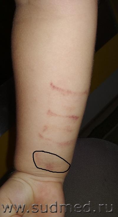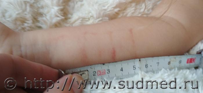 Пишу в продолжении предыдущей темы Есть такое заключение экспертизы. Документ на украинском языке, поэтому перевожу. Исследуемая часть. За разгибательных поверхностях правого предплечья от основания до уровня средней трети есть ряд 9 полосчатых ссадин, параллельных между собой, при этом 5 ссадин больше выражены, а 4 расположены в промежутках между ними, немного меньше выражены, представлены красными поверхностями, расположены практически на уровне окружающей кожи, размером от 1,2*0,3 до 4,2*0,3 см Выводы: На основании данных судебно-медицинского осмотра ребенка прихожу к мнению, что у нее имеет место: ссадины на правой руке, которые образовались от действия тупых твердых предметов по механизму трение-скольжение и могли быть получены в срок 1-2 дня до проведения осмотра. Можно ли на основании этого документа со 100% вероятностью сказать, что это следы не от пальцев? Или эта версия имеет право быть? |