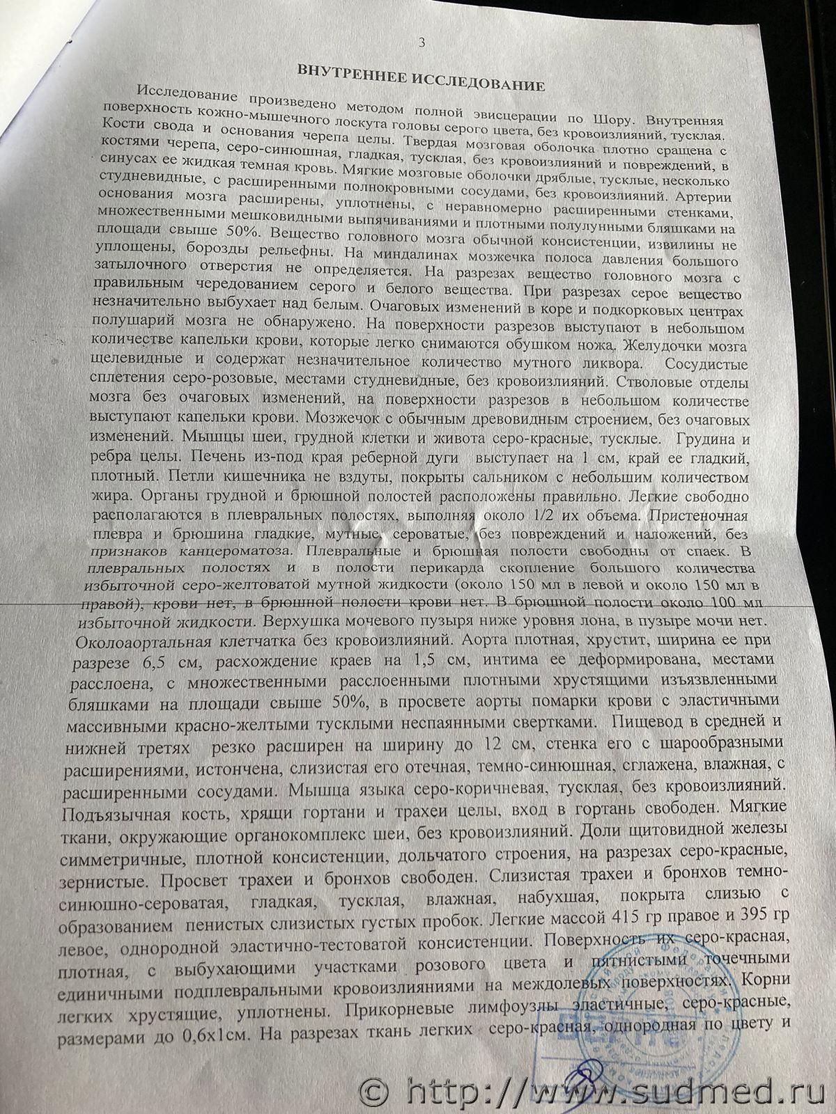 Папа умер 8 марта, во сколько именно, неизвестно, приблизительно между 16 и 21 часом. Скорую сестра вызвала в час ночи, так как папа не выходил из комнаты долго и когда она зашла его проверить, он уже был холодный. В скорой фельдшер сказал, что смерть наступила 4-5 часов назад и что смерть была внезапной. На сердце папа не жаловался , но были факторы риска ссо 3. Это я прочла в его выписке из больницы, где в 2020 году ему удаляли раковую опухоль пищевода. Точнее был удален пищевод и из желудка сформирован новый. Папа больше 40 лет купил и 30 лет злоупотреблял алкоголем, пил водку. Даже после успешной операции и лучевой терапии, через 5 месяцев запил снова. Никаких жалоб в день смерти не высказывал, чувствовал себя нормально, занимался обычными делами. Это все известно , потому что папа жил с семьей моей сестры, в тот день со всеми общался. На момент смерти примерно 2,5 недели не пил, такое иногда бывало, что мог не пить по 2 недели после длительного запоя. Извините, что много написала. Вопросы в следующем: 1.можно ли по протоколу вскрытия сказать, что смерть наступила внезапно, в один момент? Папа лежал, смотрел телевизор, как врач скорой сказал, что исходя из его опыта, папа сам не понял, что умер, судя по позе. 2. Причина смерти острая сердечная недостаточность- это то же самое, что внезапная сердечная смерть? И можно ли по заключению сказать, что говоря простым языком, оторвался тромб? 3. Могла ли грыжа пищеводного отверстия диафрагмы способствовать смерти? 4. Могло ли повлиять то, что папа лежал? Может ли быть так, что если бы он стоял или сидел, это смерть наступила бы позже? 5. О чем говорит жидкость в плевральных полостях и в области перикарда? 6. Насколько я поняла, с сердцем все было очень плохо, почему же папу это не беспокоило? Читала, что при сердечной недостаточности за какое то время до наступления смерти случаются головокружения, обмороки , отдышка. У папы этого не было. Прилагаю акт суд - мед экспертизы. С уважением, Екатерина. Эскизы прикрепленных изображений |