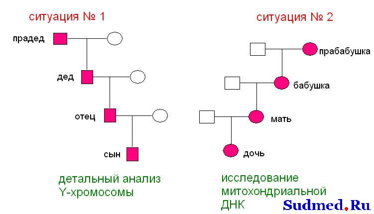 Мне не нужно устанавливать степень родства, мне необходимо, вообще, подтвердить родство. Кроме внучки есть еще правнук и больше никого. Спасибо. Уважаемый 'kirill', Установление степени родства и будет означать подтверждение или исключение родства как такового. Выводы по даже самым прямым родственным связям даются в вероятностной форме. Для наглядности возможностей современной науки установить степень родственных связей приведу рисунок. Ситуация № 1: нужно установить степень родства между любыми из представителей мужской линии. Все мужчины по этой линии несут Y-хромосому, которая и может быть использована для анализа. Изменения в ней, конечно, происходят, но они учитываемы, по крайней мере при таком небольшом числе поколений. Можно анализировать "прадеда" и "сына" (крайние в цепочке), опуская промежуточные звенья. Подойдут и братья в любой ветке. Ситуация № 2: нужно установить степень родства между любыми из представителей женской линии. Все женщины по этой линии несут и передают митохондриальную ДНК-мтДНК (мужчине она передаётся, но сам он дальше её не передаёт ни сыну, ни дочери). Подробный анализ мтДНК также позволяет в данном случае оценить родство, его степень. У Вас же ситуация, которую можно оценить как тупиковую с точки зрения современной науки. Теоретически, исследования провести можно, но на практике за такие масштабные (работа большого коллектива учёных длительное время с большими материальными затратами) вряд ли кто-то возьмётся. Всего наилучшего. Эскизы прикрепленных изображений  |