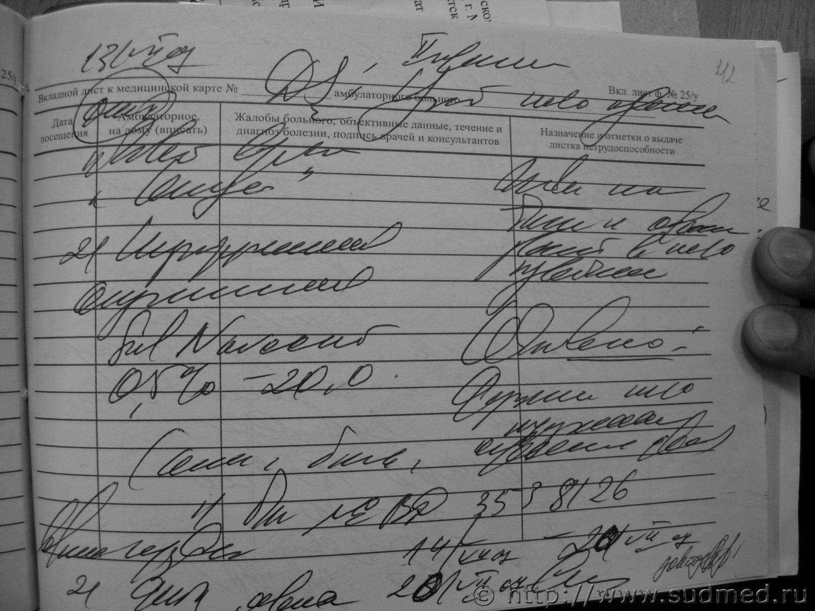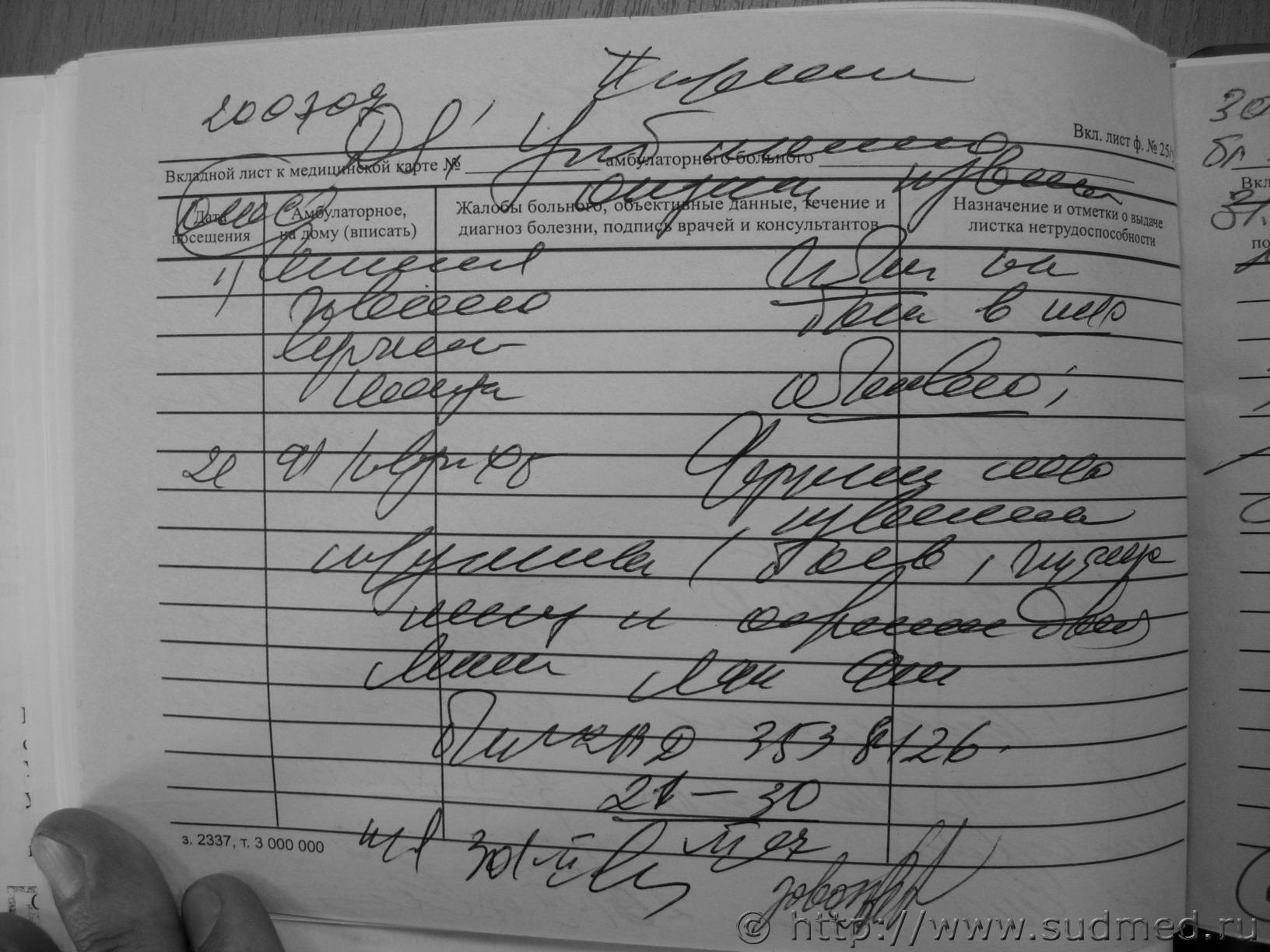 30.07.07. V (?) б/л №..., 31.07-3.08 Ушиб шейного отдела позвоночника. Жалоб новых нет. торно . Движения болезненны, незначительно ограничены. Отека нет. Нейро... расстройств нет. О(?): воротник Шонна, анальгин. Направлен в ФТО на ФТГ, ЛФК. 03.08.07. II прием Дз: ушиб ш/о позвоночника (следующей строки не видно) Опять неразборчиво, картинку приложить не получается, говорят -- превышен лимит. Могу разобрать только: жалоб нет; б/л не продлен, приступить к труду с 04.08.07. В конце: КДК! (?)! САО! 23.01.08 Выданы справки в ответ на запрос. На этом карта кончается. Получается, что на физиотерапию его отправили почти через месяц после жалобы, и нет никаких подтверждений того, что он ходил туда более одного раза (хотя назначено 10)? |