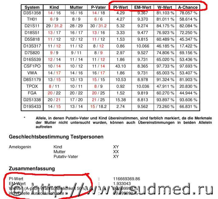 Прилагаю фрагмент заключения об установлении отцовства, сделанного в немецкой лаборатории. Некоторые термины и сокращения не понятны. Не будете ли Вы так добры указать аналогичные в русском языке в подобных заключениях в России PI-Wert - ? EM-Wert - ? W-Wert - ? A-Chance - ? Насколько обоснована, по Вашему мнению, столь высокая вероятность заключения ? Спасибо. |