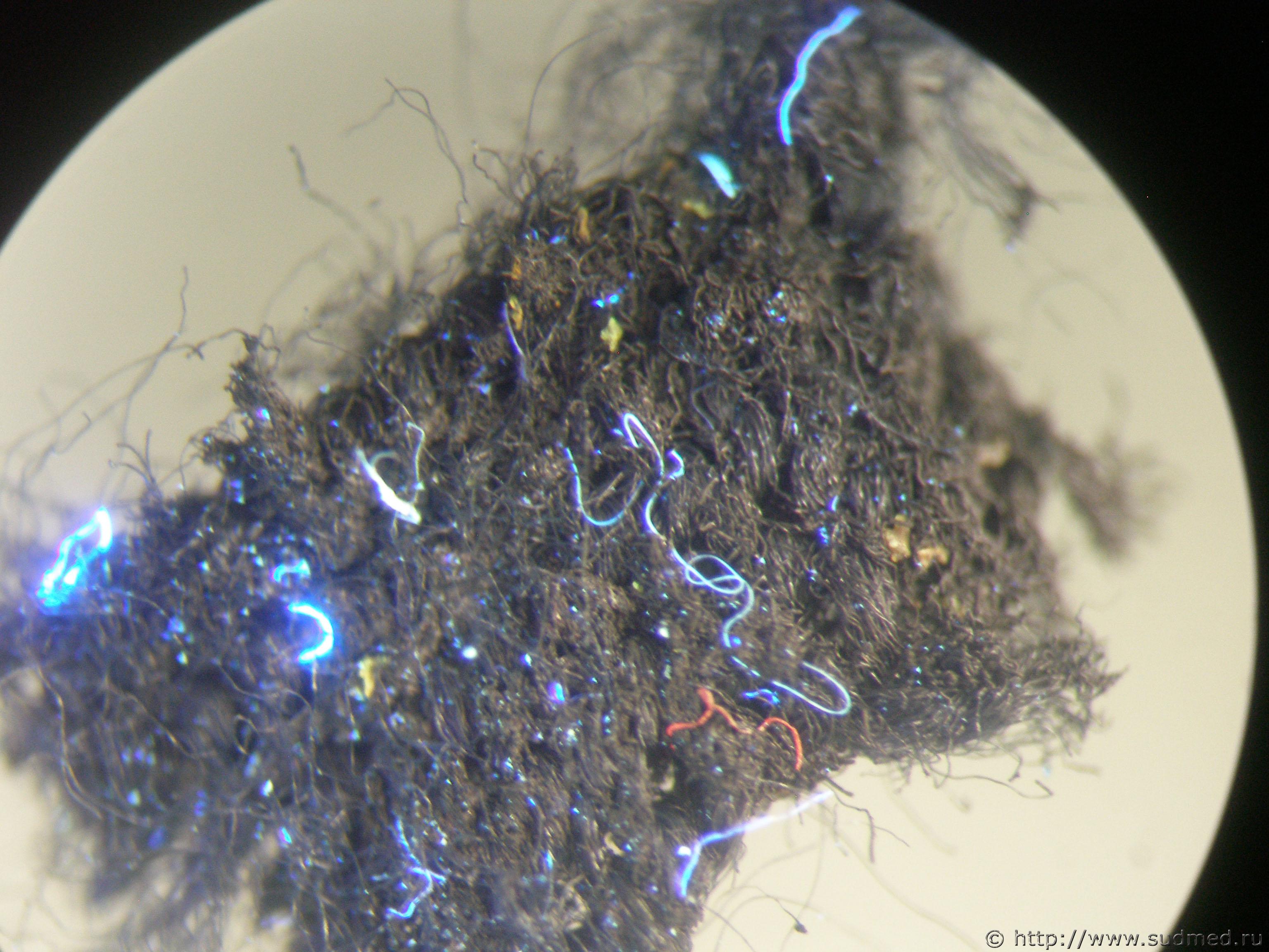 Белое свечение у волокон нитей, а желто-зеленое – это порошинки. Фотографировать в микроскопе одно удовольствие.