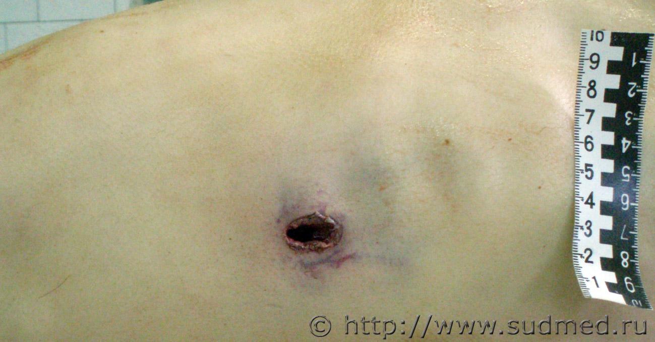Хочу поделиться случаем из собственной практики: Из обстоятельств дела: "... рядовой Х.... отлучился отправить естественные надобности в глубь леса, где в нарушение требований безопасности при обращении с закрепленным за ним оружием (автоматом АКС-74 У № ... калибра 5,45 мм), произвел выстрел холостым патроном в область живота и получил огнестрельное ранение..." Для общего развития: Автомат АКС74У выглядит так: 7Х3, 5,45-мм промежуточный холостой патрон с пулей-имитатором предназначен для имитации стрельбы: При стрельбе холостыми патронами на дульную часть ствола оружия навинчивается специальная втулка для холостой стрельбы, обеспечивающая создание давления пороховых газов, необходимого для работы автоматики оружия и измельчения имитатора пули. Пуля-имитатор - белого цвета. В данном случае втулки накручено не было. Описание ран: по передней поверхности левой половины живота в 120 см от уровня подошвенной поверхности стоп и в 3 см влево от средней линии ниже реберной дуги (левая половина эпигастральной области живота), на фоне неправильной формы осаднения размерами 5,5х4,5 см с подсохшей, почти черной поверхностью определяется повреждение, ушитое зеленой нитью одним узловым швом; края повреждения подсохшие, стянутые швом, особенности раны не различимы, для более детального исследования изъят кожный лоскут; по задней поверхности груди в 130 см от подошвенной поверхности стоп и в 4,5 см влево от средней линии, в проекции 10 межреберья определяется рана овальной формы, размерами 1,9х1,2 см с ровными, вывернутыми наружу краями, без осаднения, края раны при сопоставлении совмещаются без дефекта, рана расположена на фоне слабо выраженного красно-синего кровоподтека с нечеткими контурами, размером 2х3 см; При внутреннем исследовании: повреждение на коже левой половины эпигастральной области соединяется с раной по задней поверхности левой половины груди в проекции 10 межреберья единым раневым каналом. По ходу раневого канала повреждены: передняя и задняя стенка желудка, задняя часть левого купола диафрагмы, задне-базальный сегмент левого легкого, верхний край 11 ребра. Раневой канал проникает в брюшную и левую плевральную полости. Раневой канал имеет направление спереди назад. Общая длина раневого канал составляет около 25 см. Так же в брюшной полости выявлены повреждения: множественные разрывы большого сальника, нижней поверхности левой доли печени, селезенки, хвоста поджелудочной железы в сочетании с множественными кровоизлияниями в брюшину. Исследование изъятых объектов: Кожный лоскут восстанавливался по методике Ратневского: В центральной части кожного лоскута располагается сквозное, извитое, зигзагообразное повреждение продолговато-вытянутой формы размером 20х5 мм по окуляр-микрометру стереомикроскопа. Макро - и стереомикроскопически края раны выглядят неровными – фестончатыми, шероховатыми, размозженными, бахромчатыми за счет радиальных микроразрывов, размерами от 2х1 до 3х2 мм. Концы разрывов как и концы раны закруглены, скошены к центральным отделам раны, с немногочисленными тканевыми перемычками между краев. При сопоставлении краев раны выявляется три сквозных дефекта ткани округло-овальной формы, размерами 5х2 мм (у левого конца раны) и два по 2х1,5 мм (у правого конца раны) по окуляр-микрометру стереомикроскопа, с не сопоставляющим