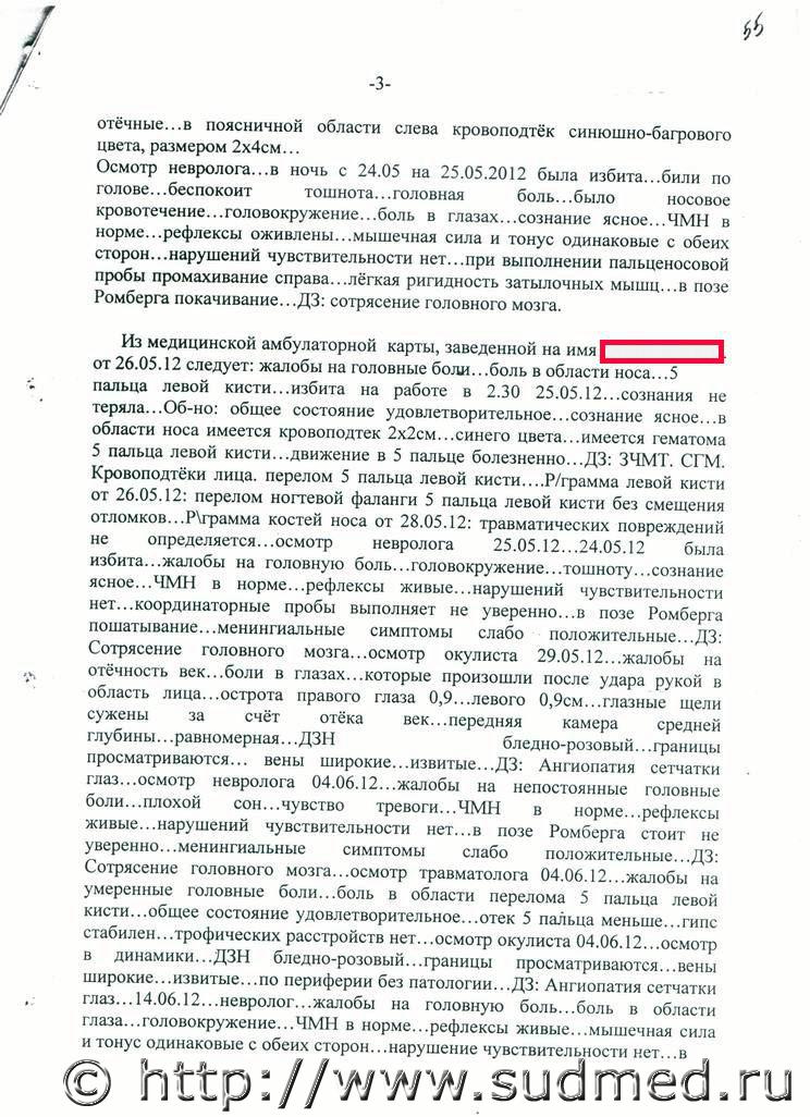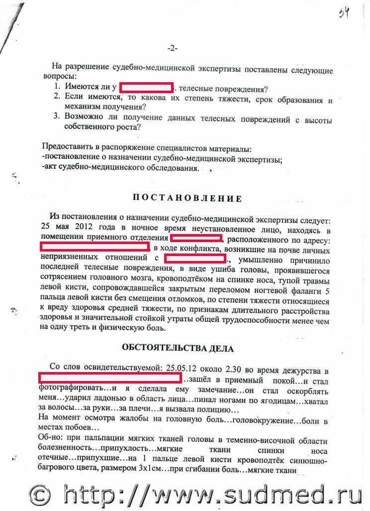 Прошу Вас проверить и оценить правильность и достоверность судебно-медицинского заключения, а так же высказать свои замечания и т.п. От этого зависит судьба человека, которого пытаются отворить... Предыстория такова. Мужчина, оппозиционер власти, борется за справедливость и сохранение медицины... Работает в системе здравоохранения... водителем. По роду деятельности оказался в приемном отделении больницы (привез больного), где работает медсестра, испытывающая неприязнь к данному мужчине... Она стала на него ругаться, вместо того, чтоб оказывать помощь человеку с инфарктом, оскорбляла его, выгоняла... Он игнорировал и пошел на выход... при этом послав ее в известном направлении... Она пошла следо за ним и накинулась на него сзади с кулаками... он отмахнулся от нее, практически не задев ее, если только тыльной стороной кисти руки... Тут вмешался еще один человек, встал между ними, дав мужчине спокойно выйти из больницы... Она вызвала полицию и заявила, что он ее избил... У нее есть покровитль в больнице, врач... Он же попросил некоторых других врачей написать ей СГМ и прочее... Хочу добавить, что девушка ушлая, 10 лет работает медсестрой - значит легко умеет симулировать, выпивает, плюс врач-покровитель подскажет как и что сделать можно... А перелом фаланги мизинца предполагаю возможным об плечо мужчины, когда махала руками... В действительности же, никаких видимых повреждений тела на девушке не было видно, не падала, сознания не теряла, по приезду полиции бегала и верещала на подозреваемого мужчину... гипс-лангету на мизинец накладывала дома у подруги, а через неделю и вообще его сняла и выкинула... Вот такие, примерно, обстоятельства. Ну вот, собственно, теперь и суть темы и вопроса по СМЭ, которую представляю на ваше обозрение. На разрешение судебно-медицинского освидетельствования были поставлены следующие вопросы: 1. Имеются ли на теле пострадавшей телесные повреждения? 2. Каков механизм их образования? 3. К какому сроку давности они относятся? 4. Степень тяжести? 5. Возможно ли получение данных телесных повреждений с высоты собственного роста? |
