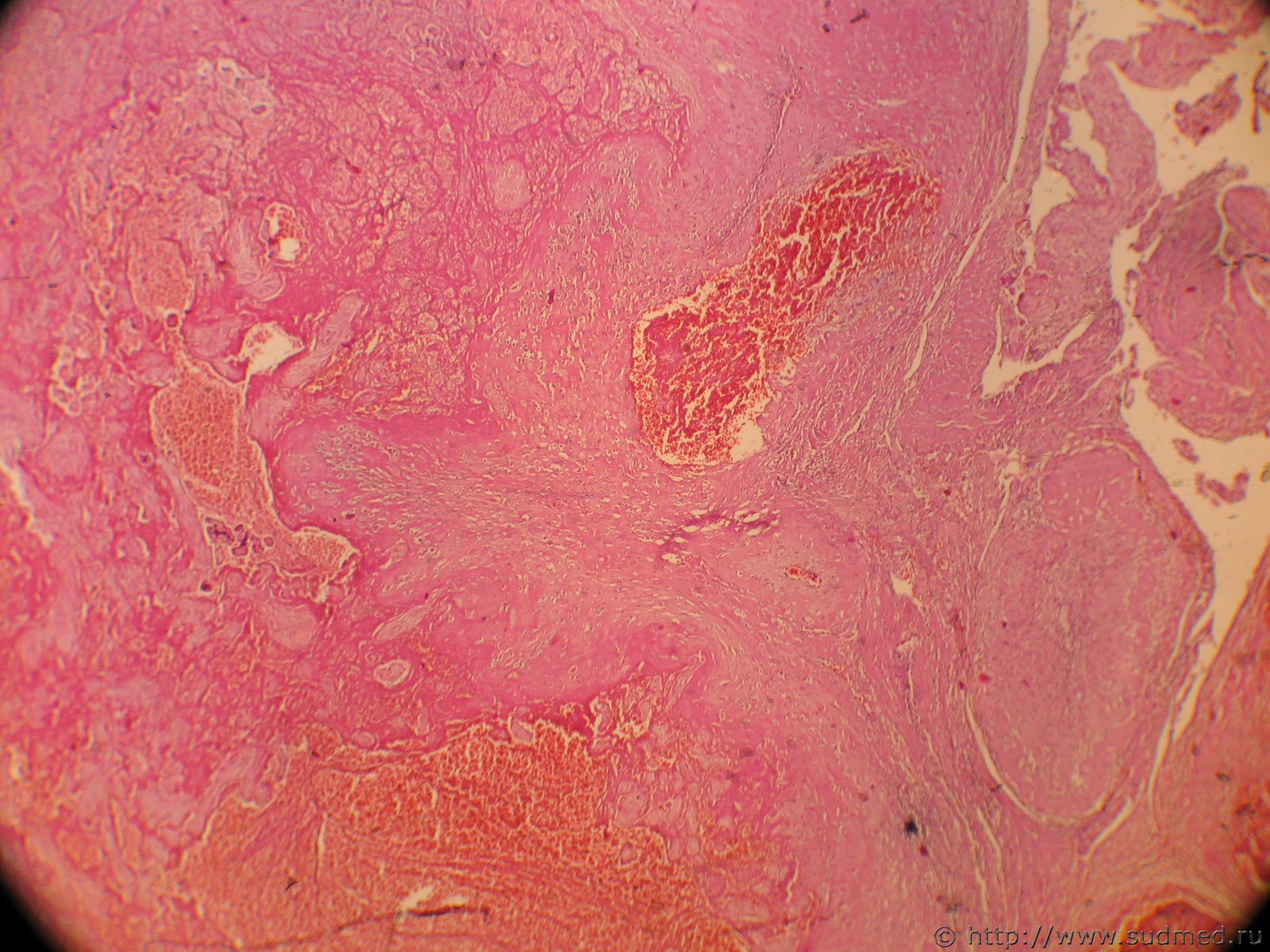 Фото 1: Вместо эндометрия некрозы, крововизлияния, тромбоз сосудов, кое-где с некрозом сосудистых стенок, лейкоцитарные инфильтраты и гиалинизированные ворсины хориона. Фото 2: гиалинизорованная ворсина |