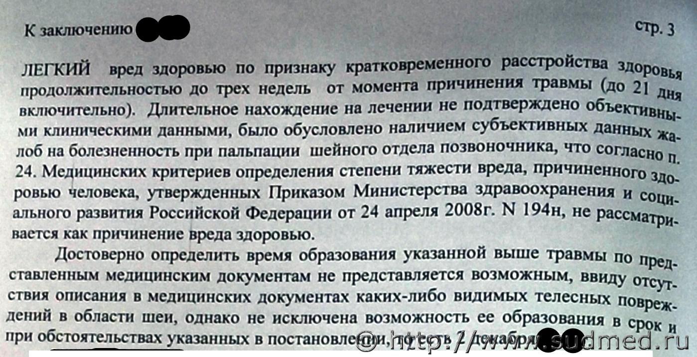 травма получена (со слов пострадавшего) 02.12 около 14-00 обращение за мед помощью 03.12 в 16-20 Интересуют ответы на следующие вопросы: 1. Мог ли пострадавший после полученной травмы на следующий день (03.12) до 13-10 продолжать вести обычный активный образ жизни - в частности безболезненно неограниченно поворачивать и наклонять голову. 2. Могли ли установленные при осмотре в ДКБ данные (ограничение движений, боль при пальпации)быть вызваны активными физическими нагрузками - тренировками по плаванию, резким загребанием снега двумя руками, бросками снега. 3. Являются ли данные, полученные при осмотре пострадавшего (ограничение движений, боль при пальпации в ШОП, на Rg повреждений нет, отечность и покраснение НЕ обнаружены) достаточными для постановки диагноза дисторсия ШОП. Можно ли ставить данные вопросы при проведении дополнительной СМЭ. Также интересуют любые комментарии по данной ситуации. Заранее благодарю за ответы. Эскизы прикрепленных изображений |