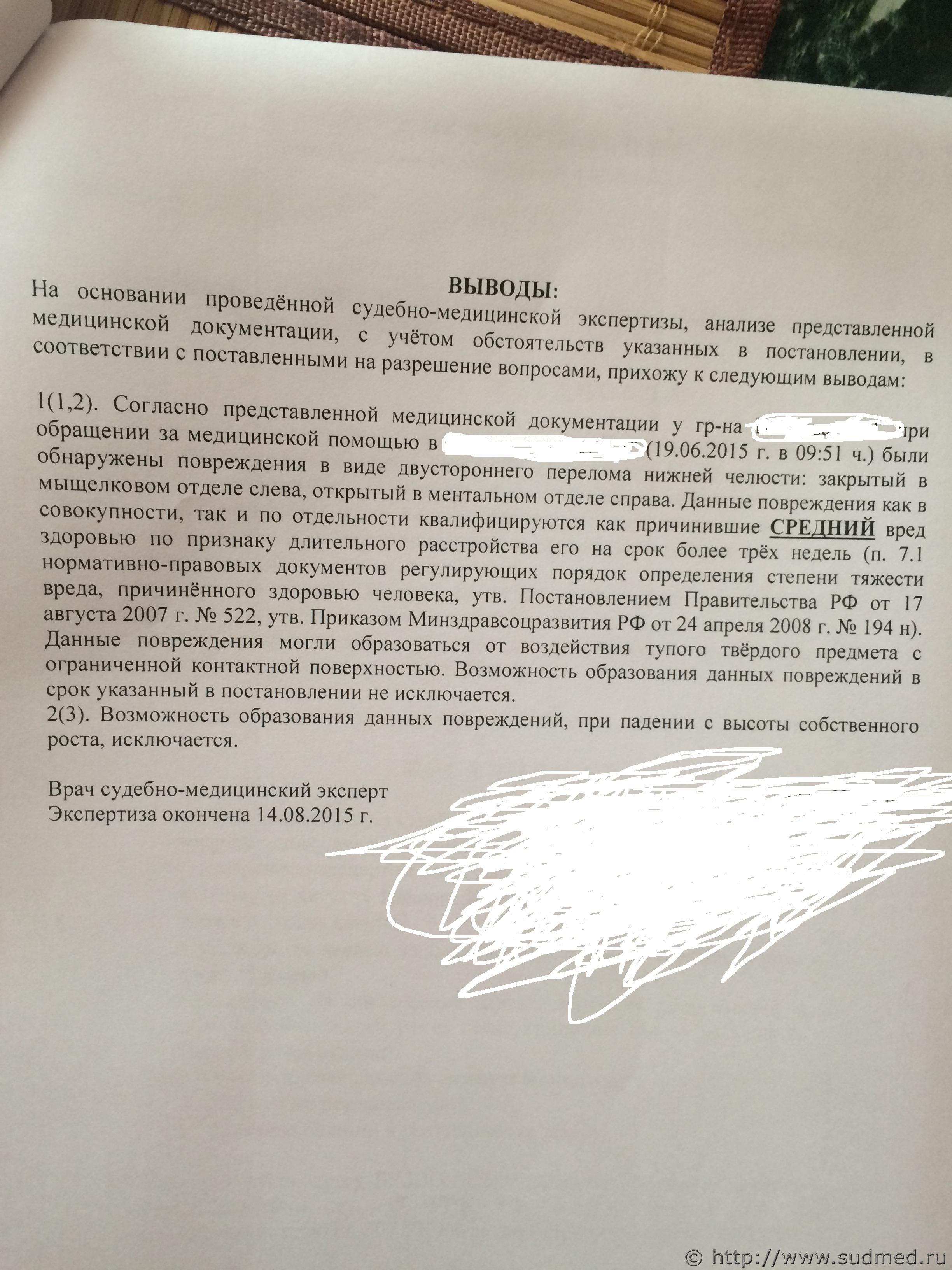 Здравствуйте уважаемые эксперты. Вся надежда на Вас. Моего сына обвиняют по ч. 1 ст.112 УК РФ, якобы он ударил человека по лицу один раз и у того образовался двойной!!!! перелом нижней челюсти от одного удара!!!! Как такое возможно вообще!!!??? Почему вред здоровью был определён как средней тяжести по признаку длительного расстройства его на срок более 3-х недель, ведь пострадавший пролежал в больнице всего!!! 7 дней. Как такое может быть??? В своём заключении эксперт указал, что при падении с высоты собственного роста такие повреждения не возможны!!! Помогите разобраться!!! У нас (меня, сына, нашего адвоката) от увиденной "филькиной грамоты" глаза на лоб повылазили!!! Мы написали ходатайство о назначении дополнительной экспертизы и задали новые вопросы и ещё больше удивились, что удар был нанесен в правую сторону лица, а в действительности удар был не сильный, один, и в левую часть лица!!!!