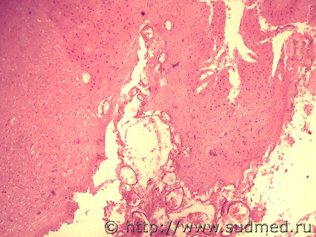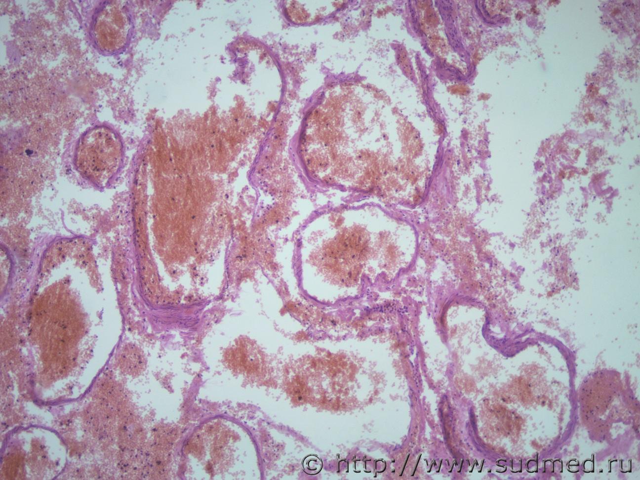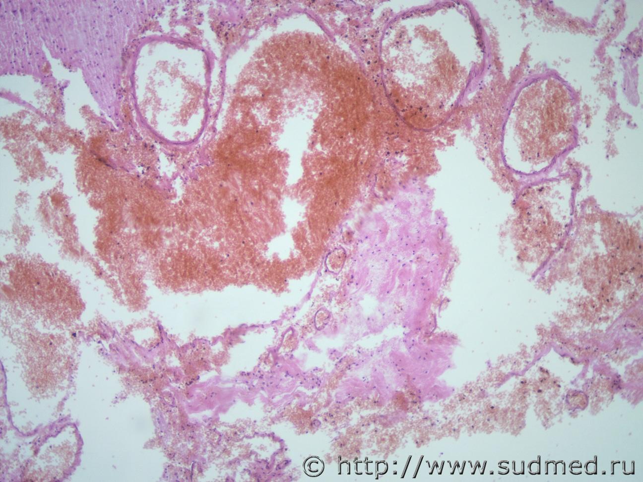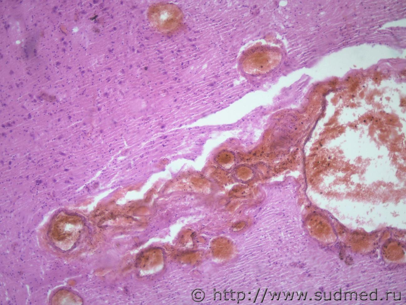 Ув. коллеги. Столкнулась с такой проблемой. Молодой человек 17 лет. в ходе драки причинены повреждения в результате которых в бессознательном состоянии госпитализирован с диагнозом ушиб г.м тяж ст. Массивный сак с прорывом в желудочковую систему, гемотампонада тотальная 3-4 жел. Через 2.5 дня умер, не приходя в сознание. на секции- сак лобной, височных долей выпуклой и базальной поверхностей, гемовентрикулюм, кровоизлияние под мягкую мозговою оболочку полушарий мозжечка, кровоизлияние в мягкие ткани головы (правая лобная, правая височная, левая скулощечная области). Ссадины, участки с внутрикожными кровоизлияниями на лице. Кровоизлияние в мягкие ткани груди слева, кровоизлияние под капсулу верхнего полюса левой почки. Микро- в стволовом отделе г.м сак и очаговые геморрагии в веществе. Переломов костей черепа нет, большая часть сак находится в базальных отделах, поэтом встал вопрос, а нет ли тут мальформации сосудов ствола? Вопрос от танатолага, гистологам, на секции эксперт подозрительных участков сосудов не видел.