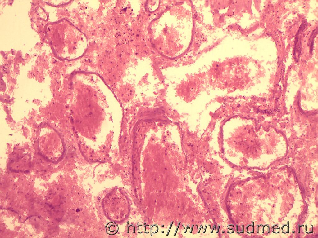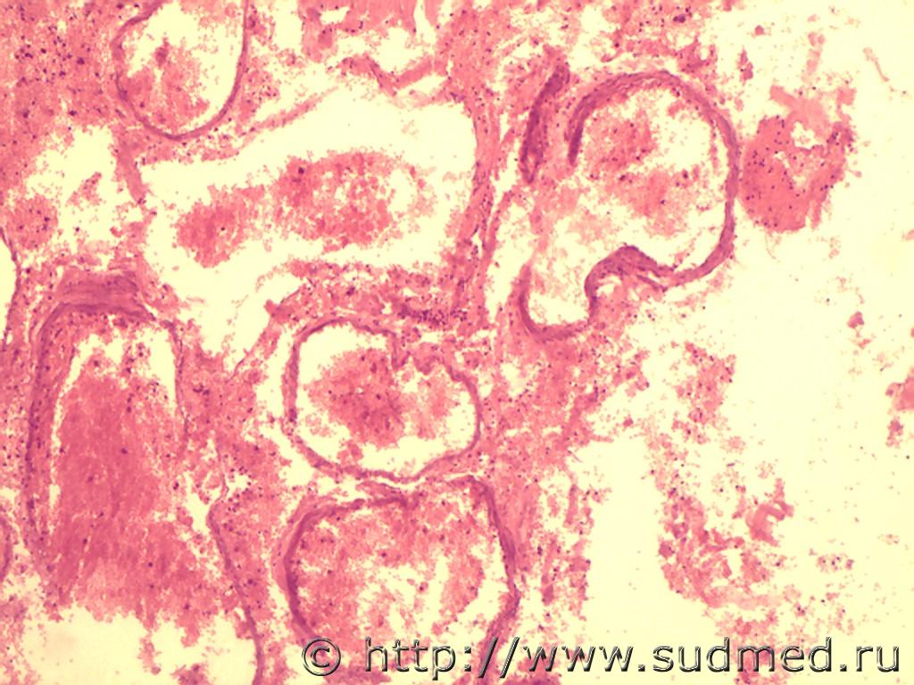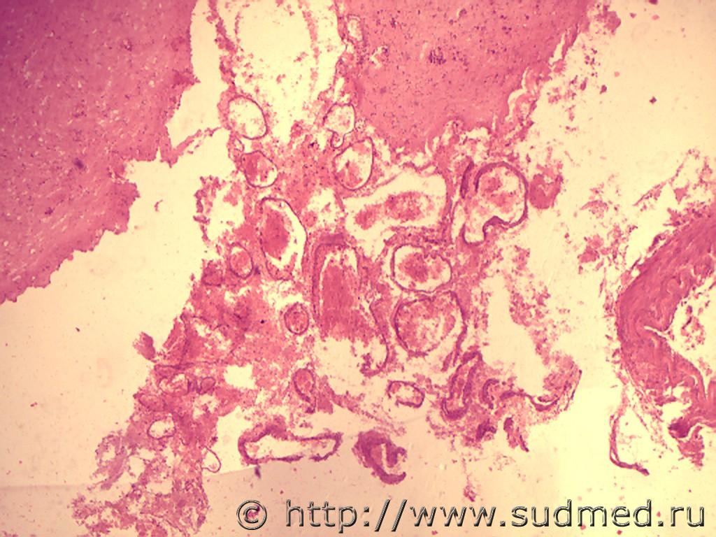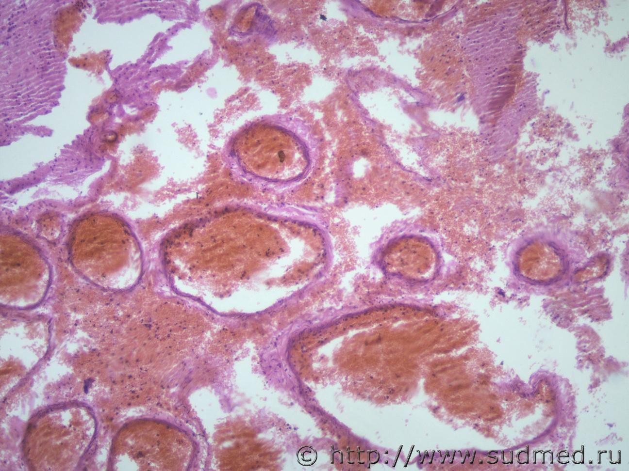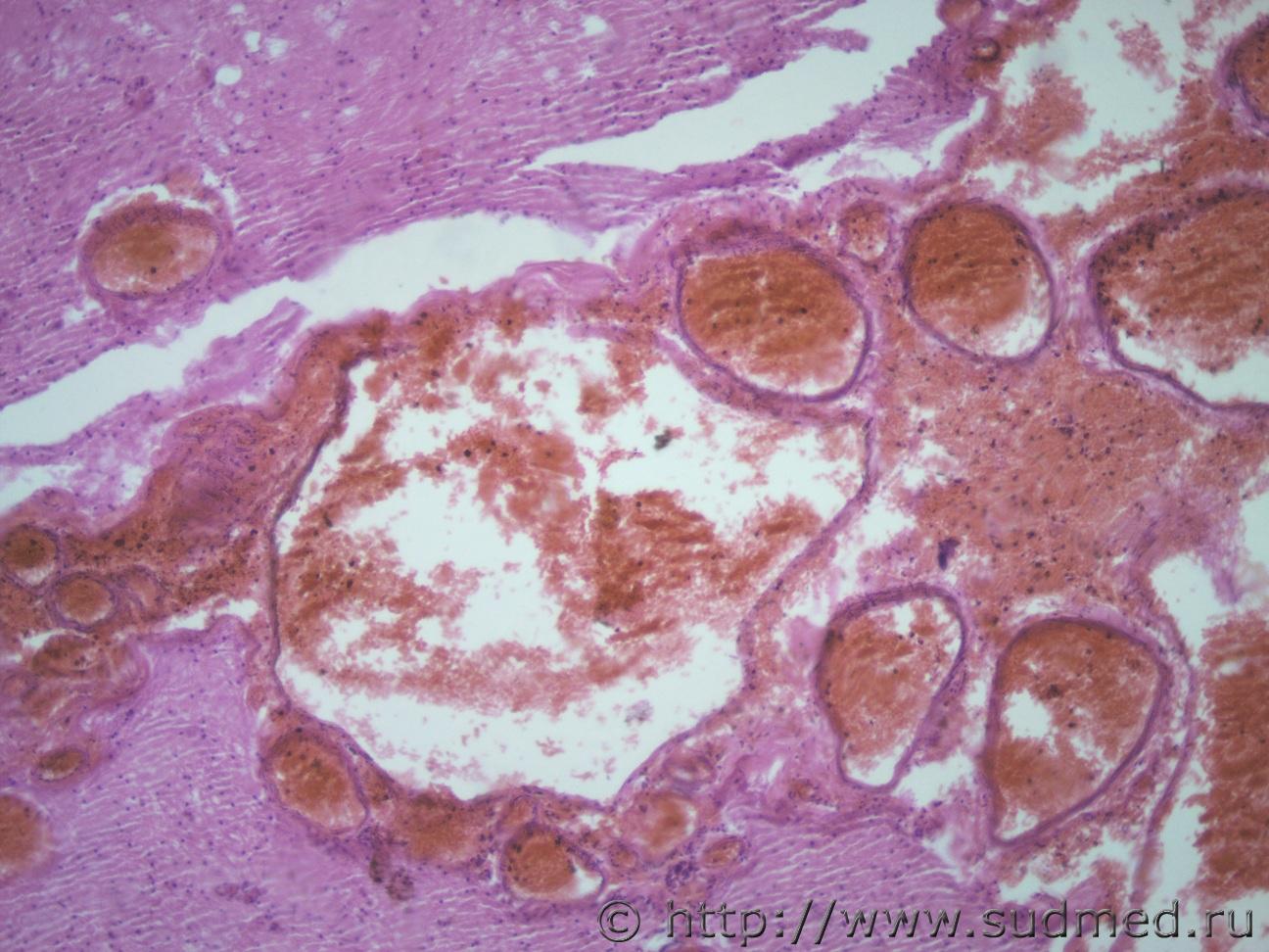 Ув. коллеги. Столкнулась с такой проблемой. Молодой человек 17 лет. в ходе драки причинены повреждения в результате которых в бессознательном состоянии госпитализирован с диагнозом ушиб г.м тяж ст. Массивный сак с прорывом в желудочковую систему, гемотампонада тотальная 3-4 жел. Через 2.5 дня умер, не приходя в сознание. на секции- сак лобной, височных долей выпуклой и базальной поверхностей, гемовентрикулюм, кровоизлияние под мягкую мозговою оболочку полушарий мозжечка, кровоизлияние в мягкие ткани головы (правая лобная, правая височная, левая скулощечная области). Ссадины, участки с внутрикожными кровоизлияниями на лице. Кровоизлияние в мягкие ткани груди слева, кровоизлияние под капсулу верхнего полюса левой почки. Микро- в стволовом отделе г.м сак и очаговые геморрагии в веществе. Переломов костей черепа нет, большая часть сак находится в базальных отделах, поэтом встал вопрос, а нет ли тут мальформации сосудов ствола? Вопрос от танатолага, гистологам, на секции эксперт подозрительных участков сосудов не видел.