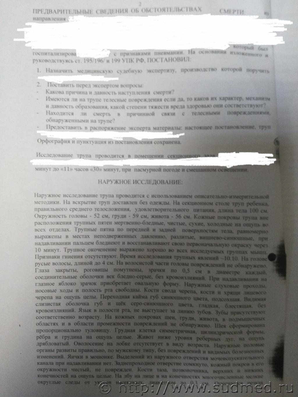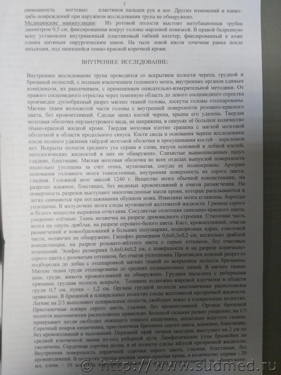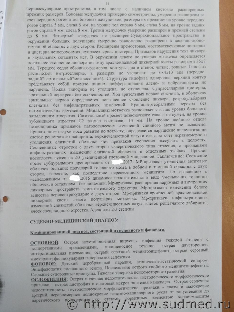 Здравствуйте. У ребенка в 3 года после проведения МРТ головного мозга под наркозом примерно через 14 часов наступила смерть. После проведения МРТ обратили внимание, что у ребенка посинел носогубный треугольник и тыльная сторона левой кисти. Врач осмотрел и сказал, что налицо низкое давление, такое состояние может быть после введенного лекарства, предупредил, что такое состояние у ребенка может быть до суток, кроме того может быть повышение температуры тела, сонливость и отправил домой. Всего в больнице находились около 2 часов, хотя направление было получено для госпитализации на сутки. По дороге домой ребенка один раз срыгнул желто-зелеными массами. Когда приехали домой, примерно через три часа после наркоза начала подниматься температура, которую сбивали только обтиранием. Созванивались с больницей, где проводили МРТ, там еще раз сказали, что такое состояние нормальное после наркоза и сбивать температуру лекарствами нельзя. Ребенок весь день спал, примерно через 9 чаов проснулся, выпил около 350 мл воды и снова уснул. Через некоторое время начались какие-то посинения, после этого вызвали скорую, доставили в больницу, где несмотря на реанимационные мероприятия ребенок скончался. Анамнез: в 7 месяцев ребенок перенес пневмонию, через 2 недели после выписки из стационара заболел менингитом. В период лечения менингита выявили субдуральную гигрому головного мозга слева. Которая впоследствии после лечения ушла и не обнаруживалась при дальнейших обследованиях. Ребенок начал отставать в развитии (задержка речи, психо-моторного развития). Физически (рост, вес) был немного крупнее своего возраста. Был поставлен диагноз: энцефолапатия смешанного генеза, последствия перенесенного острого гнойного менингоэнцефалита, тугоухость, в связи с судорогами на фоне температуры - эпилепсию под вопросам. Установлена инвалидность. В течение примерно года постоянно болел респираторными заболеваниями. Прошел обследования на состояние имунного статуса, основные генетические заболевания, обследования сердца, никаких отклонений не было выявлено. Проходил реабилитационные мероприятия. Через полтора года после перенесенного менингита диагноз-тугоухость был снят. В связи с тем, что ребенок переболел менингитом в возрасте до одного года поставили диагноз, ДЦП, атонически-астатический синдром. Примерно в два года первый раз сел самостоятельно и в этот же период перестал болеть респираторными заболеваниями (более года ничем не болел). Далее развитие начало прогрессировать, стал уверенно сидеть, начал ползать, обращать внимание на игрушки, окружающую обстановку. После последнего посещения реабилитационного центра у ребенка было несколько приступов как будто он чего-то пугался, он вскрикивал. Обратились к неврологу, который предположил, что на фоне физической активности у него были эпилептические припадки. Отменил все физические нагрузки, массаж и порекомендовал сделать повторно МРТ головного мозга для сравнения с ранее сделанным МРТ (за два года до этого). Вывод эксперта предполагает основной диагноз:острую неустановленную вирусную инфекцию тяжелой степени с полиорганными проявлениями, молниеносное течение и т.д. Вопросы: 1. Правильный ли вывод сделал эксперт? 2. Если неправильный, то в чем? 3. Каким образом должен быть обоснован вывод наступив