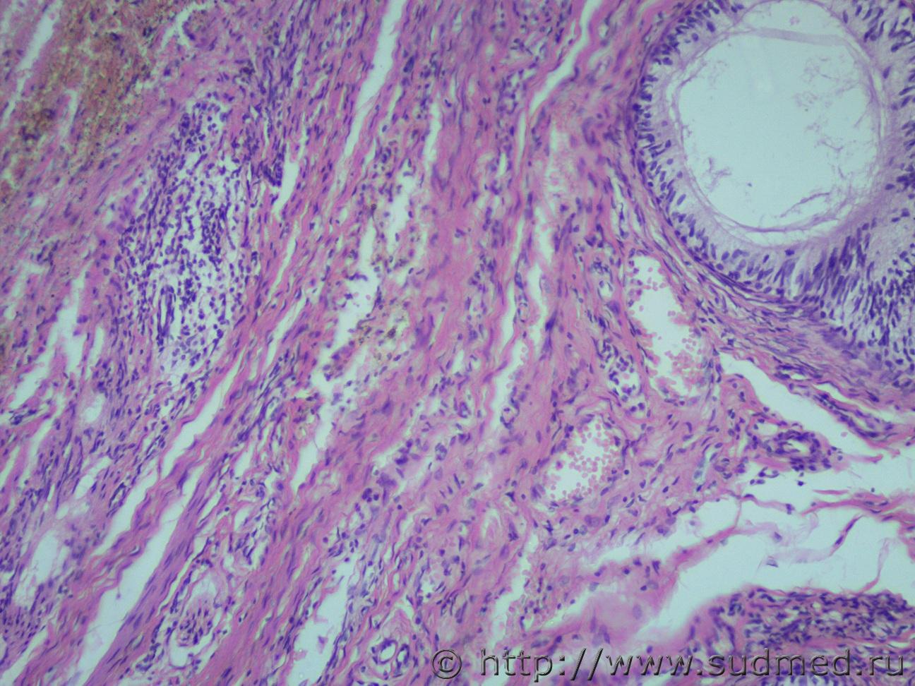 Ув. коллеги нужна помощь. У мальчика 15 лет появились резкие боли в правой половине мошонки. ДЗ: орхоэпидидимит справа. Данных за перекрут канатика нет. 1,5 мес. консервативного лечения и повторные УЗИ (некротически измененный придаток?) с выраженным его увеличением в объеме. Операция: высокая орфофуникулоэктомия справа по поводу перекрута и некроза правого яичка. Необходимо установить давность некроза яичка. 1-5 белочная оболочка и ткань яичка