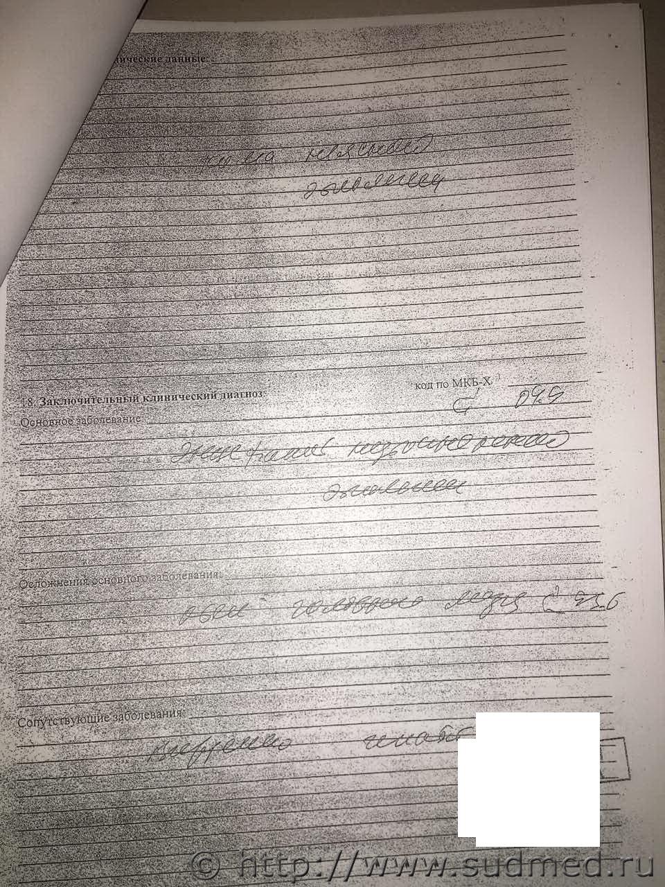 Проконсультируйте, пожалуйста, по протоколу вскрытия. В заключительном клиническом диагнозе, предварительном патолого-анатомическом диагнозе гепатит "С" указан как сопутствующее заболевание. В патолого-анатомическом диагнозе в разделе сопутствующее заболевание указано: "в анамнезе гепатит "С" с 1995 г. Антитела к вирусу гепатита C присутствуют". В клинико-патолого-анатомическом эпикризе указано: "Основное заболевание на фоне вирусного гепатита "С". В медицинском свидетельстве о смерти в качестве причины смерти гепатит "С" не указан. Можно ли сказать, что смерть произошла в результате гепатита "C?" Может ли врач указать в протоколе вскрытия гепатит "С" только на основании данных, полученных от родных, без проведения исследования? Если в протоколе вскрытия указано, что антитела к вирусу гепатита "С" присутствуют, значит ли это, что было проведено исследование крови? Должно ли в протоколе вскрытия отражаться, что была взята кровь для исследования на антитела к вирусу гепатита "С"? Почему в протоколе вскрытия гепатит "С" указан, а в медицинском свидетельстве о смерти - нет? Спасибо Эскизы прикрепленных изображений |