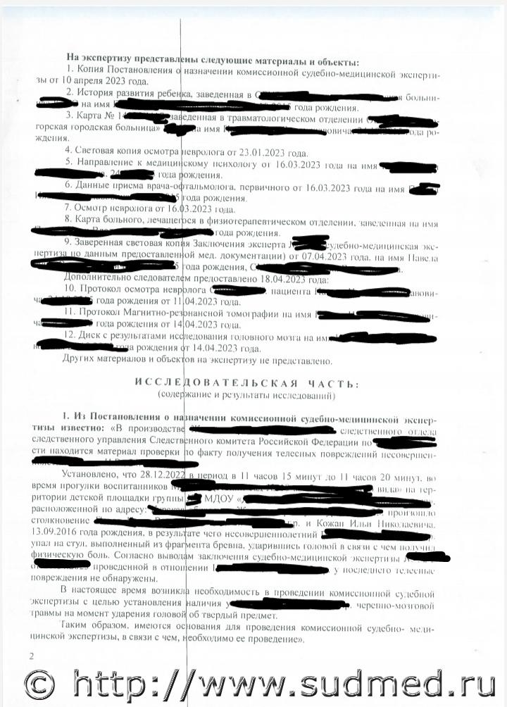 Здравствуйте, уважаемые эксперты! Коротко- ребенок получил травму в ДС зимой,был в теплой шапке,упал затылком о порог веранды с размаху.Помощь ему оказана не была,о травме сотрудники не сообщили,я узнала только когда ночью началась рвота,госпитализировали,9дней в стационаре, диагноз при выписке «ЗЧМТ.Сотрясение головного мозга».Первая экспертиза приходит с выводом об отсутствии телесных повреждений,ТК в меддокументах нет указания на ссадины,ушибы и пр.,а нарушенные функции эксперт почему-то не рассматривает.В возбуждении уголовного дела отказывают,мы оспариваем отказ,назначают новую экспертизу,вместо комплексной комиссионную.Пришел результат,и у меня очень много вопросов.Я прикрепила фото,но если кому-то удобнее будет читать здесь текстом,для экономии времени перечислю объективную симптоматику,зафиксированную медиками