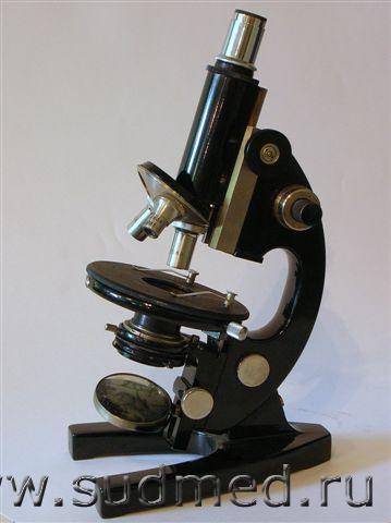 В судебно-медицинской экспертизе мог (и может) быть использован любой световой микроскоп проходящего света, а равно любой стереомикроскоп, все - вне зависимости от более детальных характеристик и места выпуска. Поэтому, если Ваш образец относится к одному из этих видов, то - мог использоваться.