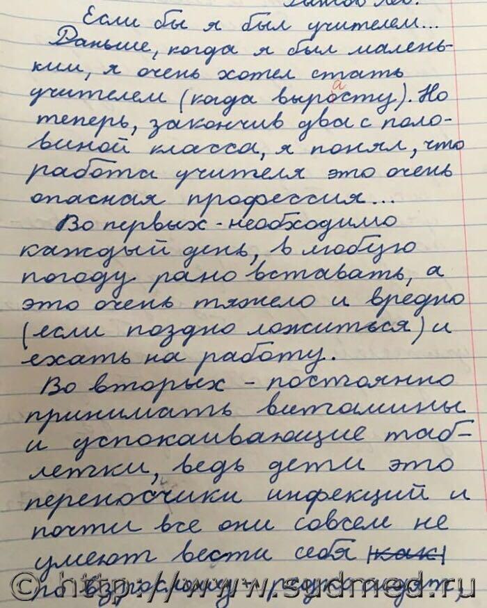 Сегодня ребенок хвастается своими успехами в школе, показывает тетрадку по русскому языку, где стоит огромная, "жирная" пятерка, я улыбнулась и говорю: - респект учителю русского языка от преподавателя высшей школы, передай; а она мне отвечает: -ты считаешь, что это современно, но это так старо уже, ты будешь выглядеть "старушкой" я была в ауте цитата: РЕСПЕ́КТ и (ирон. шутл.) решпект, респекта, муж. (лат. respectus) (устар.). Уважение, почтение. Оказать кому-нибудь респект. Иметь к чему-нибудь респект. Держать кого-нибудь в решпекте (заставлять уважать, бояться себя, не допускать с кем-нибудь близости, фамильярности). Кстати об учителях от моих друзей: Приходит новая учительница и говорит: — Здравствуйте, дети,я ваша новая учительница. Меня зовут Марихуана Гашишевна. Вот скажите, дети, как летают птицы? Весь класс дружно: — Косяками!!!! Учительница: — А как ездят машины? Класс: — На колесах!!!! Учительница: — А что зимой едят коровы? Класс: — Трааавкуууу!!!!!! Учительница: С сегодняшнего дня у нас все будет по—новому. Так вот, дети, птицы летают стаями, машины ездят по дороге, коровы зимой едят сено. А фамилия моя — Современный урок литературы в школе. Учительница: — А теперь, дети, пишем комменты к «Войне и Миру»... со смыслом.... |