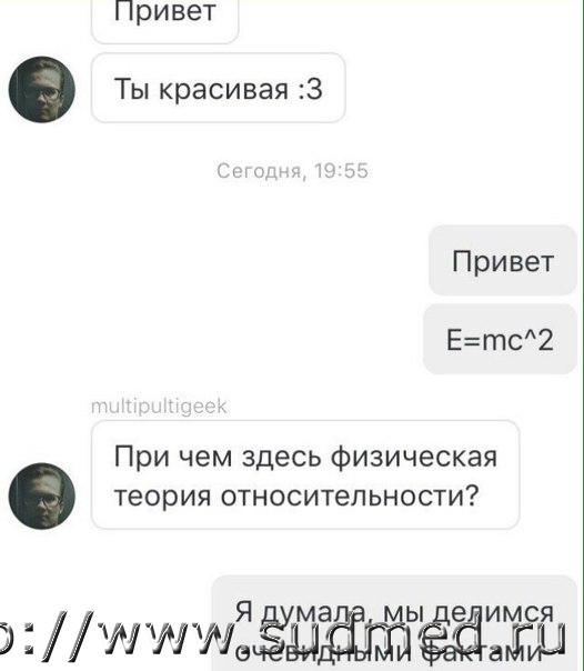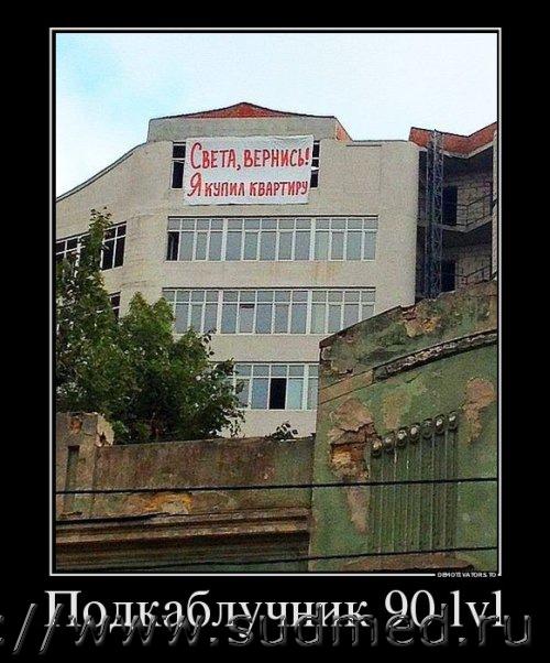 В книге Достоевского `Преступление и наказание` Раскольников отозвал лицензию у микрофинансовой организации Сломался у женщины кран. Приходит симпатичный сантехник, все быстро починил. Она думает "сейчас прижмусь в коридоре, может срастется...?". Сраслось так!!! Небо отдыхает!!! Поделилась радостью и опытом с подругой... та быстро сломала газовую колонку, сидит надеется! Приходит симпатичный газовик, все быстро починил. Подруга думает "сейчас прижмусь в коридоре...." Газовик ее загибает и в задний проход... Подруга стонет "ниже, ниже заходи..." А газовик: "ниже это к сантехникам!!! А мы горГАЗ-З-З-З!!!" P.S. от LisSB исключение из правил в действии: От перестановки мест слагаемых... итог меняется... В армии не любят полицию, а в полиции армию, потому что в полиции уже все «господа», а в армии по прежнему «товарищи». Объявление: Ищу мужчину со стержнем! P.S. Фото стержней не присылать! С такой легкостью и усмешкой отшиваешь всех мужиков - Детка, я из города ангелов. - Лос Анджелес? - Архангельск. К психологу уже поздно. К психиатру страшно. Ирония судьбы: нам еще не переслали фотографии со свадьбы, а мы уже разводимся. |
