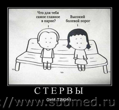 1. У свиньи оргазм длится 30 минут. (30 минут! Нифигасе... Хочу быть свиньей в следующей жизни! ) 2. У сомов более 27 000 вкусовых рецепторов. (И что там такого вкусного на дне? ) 3. Таракан живет без головы 9 дней, после чего умирает от голода. (Я все о свинье думаю... ) 4. Блоха может прыгнуть на расстояние в 350 раз превышающее длину своего тела. Все равно, что человек перепрыгнет через футбольное поле. (30 минут. . блин... повезло свинье... только представьте! ) 5. Слоны — единственные животные, которые не могут прыгать. (Так даже лучше. ) 6. Некоторые львы сношаются более 50 раз в день. (Все равно хочу быть свиньей в следующей жизни — качество превыше количества! ) 7. Кошачья моча светится в ультрафиолетовом освещении. (Интересно, кому заплатили, чтобы он это выяснил? ) 8. Глаза у страуса больше, чем его мозг. (Я знаю несколько таких людей) 9. У морской звезды вообще нет мозга. (И таких людей я знаю) 10. Люди и дельфины являются единственными видами, которые занимаются cекcом ради удовольствия. (Эй!!! А как же свинья? ) — Он назвал меня единственной и неповторимой! — Прям так и сказал? — Ага. "Ты с@ка, — говорит, — каких не бывает". После интима. Она: — Ну, ты добился, чего хотел? — Ну, в общем-то, да! А ты? — Тест покажет. Муж: - Точка G есть? -... - А если найду? Девиз холостяка: ”Нас голыми ногами не возьмешь”. LisSB: А так Слабыми мужчинами управлять проще, сильными - приятней. Поэтому, чтобы не терзаться в раздумьях, умные женщины выбирают богатых Женщины любят мужчин в форме, мужчины - женщин с формами. |