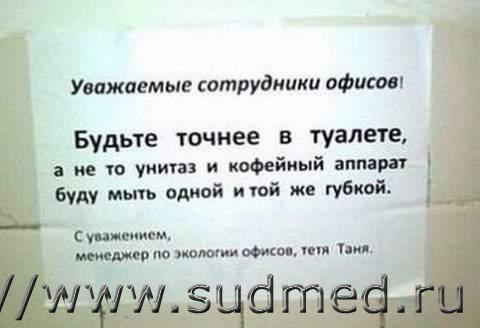 Мы провели подобное исследование, только вместо чемодана оставляли на вокзалах симпатичную девушку. Результаты оказались похожими: - В Стокгольме девушку никто не тронул. - В Лондоне девушку за 30 минут трижды спросили который час, дважды сообщили, что погода нынче хорошая, и один раз предложили чаю. - В Париже – девушку украли через двадцать минут, и через пять минут вернули на место. - В Риме – через десять минут девушка сама сбежала с симпатичным итальянцем. - В Токио через пять минут девушку намазали белой краской, одели в кимоно и стали фотографироваться с гейшей. - В Иваново через 3 минут украли ученого, который следил за девушкой. - В Тель-Авиве девушку приняли за секс-бомбу, через минуту приехали саперы и ее обезвредили. - В Одессе точного результата получить не удалось, так как, пока исследователь смотрел на девушку, у него украли часы. А пока он спрашивал у прохожих время – украли девушку. - В Амстердаме вообще смешно получилось. Но никто не помнит, что именно... В тебе живет маленькое существо. Оно ничего не видит и не слышит, но очень любит тебя. Фонд защиты ленточных червей. Сохрани жизнь. Основные способы лечения любых заболеваний у гинеколога в госполиклинике по возрастам: 14 лет: "ну мальчик появится - и все пройдёт" 20 лет: "ну вот родишь - и всё пройдёт" 27 лет: "второго родить надо - и всё пройдёт" 38 лет: "ну что вы ходите - возраст, тем более рожали" Две подруги: - Мне с котом не повезло - агрессивный, всё время хочет жрать, и шляется до поздней ночи. - Зачем терпишь - разводись с этим скотом! Петя - мастер спорта по лыжным гонкам. Вася - наёмный убийца. В среднем, оба занимаются биатлоном. Брачная ночь процедурной медсестры: - Та-ак, подходим, штанишки снимаем! Любой спор можно выиграть, используя по очереди три фразы: 1. И что? 2. Ты сам-то понял, что сказал?! 3. Обоснуй! - Мерзавец, во время секса ты назвал меня Катей! Ты совсем совесть потерял!? - Люся, я потерял не совесть, а очки! - Рабинович, зачем в столовой вы заказываете две половинки борща, а потом их сливаете в одну тарелку. Не проще ли делать как все - заказывать полный борщ? - Сема, вы не понимаете. Так у меня получается одна порция борща с двумя порциями сметаны. |