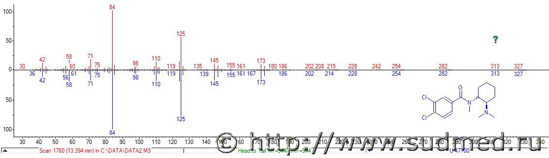 U-47700 is a structural isomer of the earlier opioid AH-7921[7] and the result of a great deal of work elucidating the quantitative structure–activity relationship of the scaffold. Upjohn looked for the key moieties which gave the greatest activity[8] and posted over a dozen patents on related compounds, each optimizing one moiety[9][10][11][12][13][14][15][16] until they discovered that U-47700 was the most active.[17] U-47700 became the lead compound of selective kappa-opioid receptor ligands such as U-50488, U-51754 (containing a single methylene spacer difference) and U-69,593, which share very similar structures.[18][2] Although not used medically, the selective kappa ligands are used in research.[19][20] Name: U-47700 Formula: C16H22Cl2N2O MW: 328 Exact Mass: 328.110918 ID#: 4425 DB: swgdrug_nist_20160714 Comment: DEA SWL 10 largest peaks: 84 999 | 125 762 | 58 189 | 124 185 | 110 179 | 71 174 | 145 171 | 173 146 | 42 119 | 147 110 | Synonyms: 1.rel-3,4-Dichloro-N-[(1R,2R)-2-(dimethylamino)cyclohexyl]-N-methylbenzamide Эскизы прикрепленных изображений |