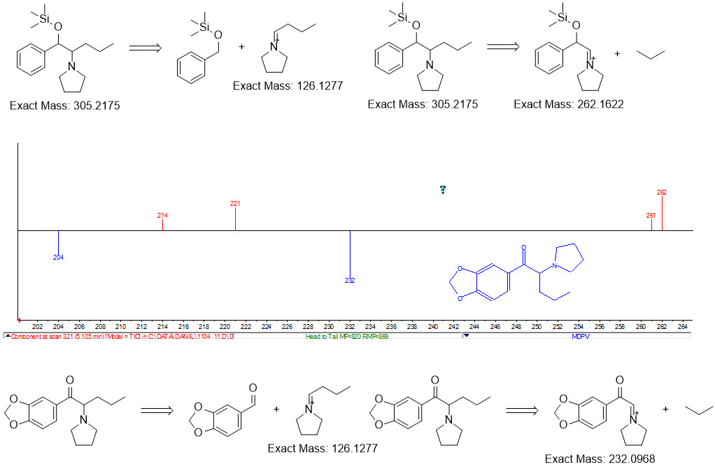 Здравствуйте коллеги ! Помогите, пожалуйста, определить в-во-смыв со шприца. По обстоятельствам -употреблял наркотики . В крови и гидролизной почке- идентичные пики(дериватизация пропионовым ангидридом ) , отсутствующие в имеющихся библиотеках. Заранее благодарю.
