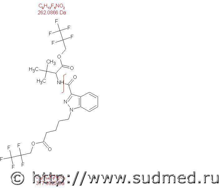 Здравствуйте, коллеги! Посмотрите пожалуйста масс-спектр. Я идентифицировал его как пентафторпропионовое производное каннабимиметика MDMB(N)-2201. Верно ли это? Скажем так, приведенная структура не противоречит масс-спектру. Часть ионов не подписана на рисунке. Хвостик именно третбутил, минимум два иона в спектре об этом намекают. Ядро индазол. А вот употребление чего идентифицировали, это вопрос. Метаболит основной у 5-F-ADB-PINACA и MDMB(N)-2201 будет общий. |