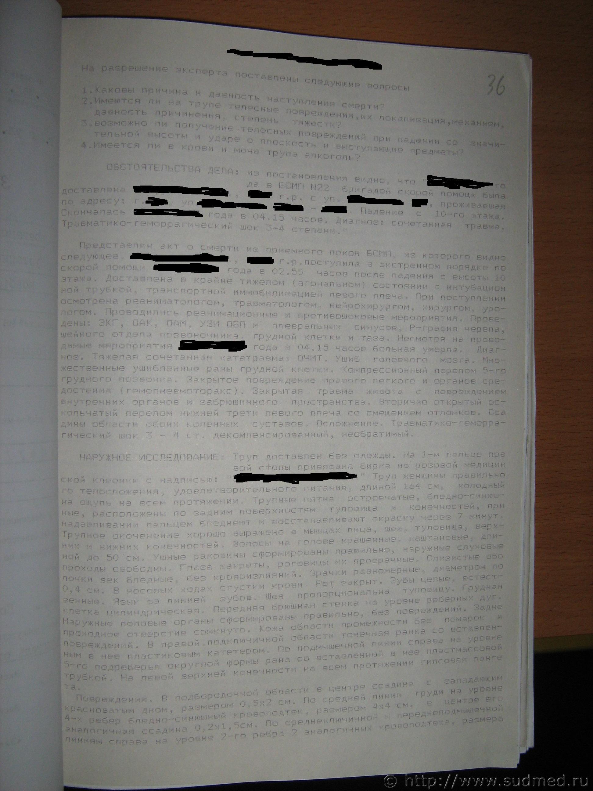 Цитата Мы исходим из того,что в предполагаемое положение в которое она упала могла упасть только если бы ее вытолкнули бы головой вперед и выбросили бы. и на чем оно базируется? Падение с высоты вопрос достаточно сложный и в принципе малоизученный. Но некоторые выводы все же можно сделать: поскольку падение было с достаточно большой высоты (10 этаж), а чем больше высота, тем больше вариабельность смены положения тела во время полета, да и неизвестно, группировалась ли девушка во время полета или нет, что может также влияет на смену положения тела; - падение похоже на свободное(без преград по пути) и пассивное(то есть отрыв тела был без предварительного смещения (вися на руках), о чем кстати говорит и свидетель), о чем свидетельствует практически прямая траектория(линия) полета (как Вы говорите "строго вертикально") - с местом соударения и локализация повреждений Вы определились (во всяком случае будем учитывать изложенные выводы), исходя их них, скорее имело место падение в горизонтальном положении. Данных за повреждения, которые могли бы говорить о возможной борьбе и сопротивлении я так понимаю нет, вопрос о бессознательном положении, Вы все же скорее не поняли сначала- что может подталкивать к таким выводам? (алкогольное, наркотическое опьянение). Понимаю Ваше горе и вполне естественно, что просто невозможно поверить в случившееся, но почему так произошло не всегда возможно понять. В любом случае, судебно-медицинских данных, которые могли бы, на мой взгляд кроме вышеизложенных, прояснить ситуацию нет. Обстоятельства в данном случае нужно устанавливать следственным путем. |