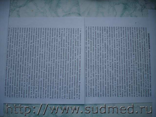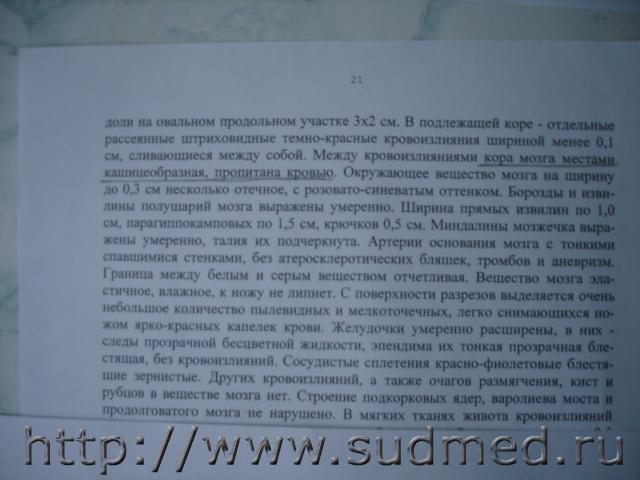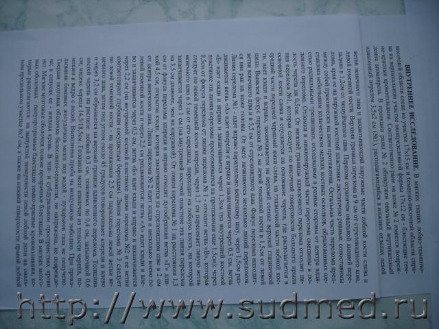 1. Нам нужен полный текст экспертизы, а не выборки. 2. Текст читается с трудом (для 13,5Мег. очень странно). 3. И сообщите краткие обстоятельства дела. Откуда появилось какое-то падение? 1. Я использовала фотоаппарат, который у меня специально для документов 8.5 мп, есть новый еще неосвоенный 13.5. 2. Выборки, чтобы не затруднять Вас описаниями остальных повреждений, которые частью есть на этих страницах и для того, чтобы уменьшить отсылаемый объем; сняла все, что относится к ЧМТ. Сейчас срочно мне нужно выяснить механизм нанесения ЧМТ, поскольку именно этот вопрос будут поднимать в суде по поводу целесообразности эксгумации. 3. Обстоятельства дела я бы сейчас не хотела выкладывать здесь, если нужно, с Вашего разрешения могу сообщить лично Вам. Падения - это придумки следствия для оправдания убийц. Может все-таки повторить переснять с 13.5 мп? Если нужно, то сделаю, можно увеличить разрешение, но тогда придется посылать отдельно в нескольких сообщениях. Сообщите, пожалуйста, Ваше решение. Спасибо. |
