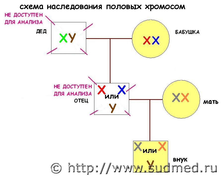 Ребёнок - мальчик. Братьев и сестёр нет. Других детей у мужа тоже нет. 25% взял как то, что ДНК ребенка на 50% состоит из ДНК отца, и, следовательно, на 25% - из ДНК бабушки. Хотя тут скорее доказать можно будет (если будет можно) с 50% вероятностью - по половине материала. Предлагаю рассмотреть две схемки. Они сильно упрощены, но суть отражают. На первой отражено наследование половых хромосом. Как видно из рисунка, бабушкина X - хромосома к внуку не попадает. А вот Y-хромосома "идёт" по мужской линии от дедушки к внуку. Что касается аутосом (их количество на схеме ограничено шестью), то может и меньше четверти хромосом "попасть" от бабушки в геном к внуку. В общем, работать можно много и упорно, а результатирующий вывод будет (объективно) некатегоричным. Удачи.  |