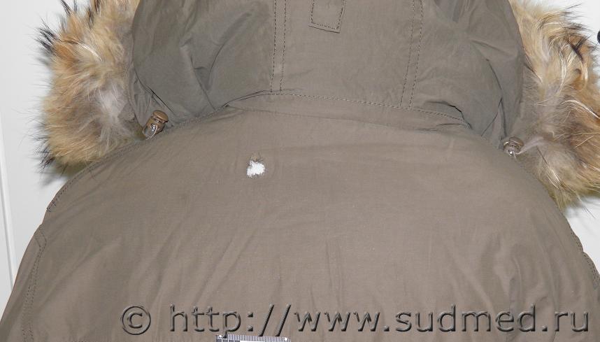 Повреждения на капюшоне указывают на то, что в момент выстрела он был не только снят с головы,но и вывернут наизнанку. Только при таком положении возможен вертикальный разрыв и одновременноеповреждения воротника-стойки. Сам механизм представляется следующим образом: дульный срез под очень острым углом ( к одежде) был направлен верх. Отложение порошинок указывают на примерное место его расположения. Верх куртки на спинке - был "содран" газами выстрела (на что указывает отсутствие копоти и порошинок на проладочном материале, а так же наличие дополнительных вертикальных надрывов в верхних отделах дефекта. Пореждения на капюшоне и воротнике-стойке образовались от непосрественного действия дробин, имеющих практически вертикальное направление. От действия одной из них образовалось и ранение в затылочной области. |