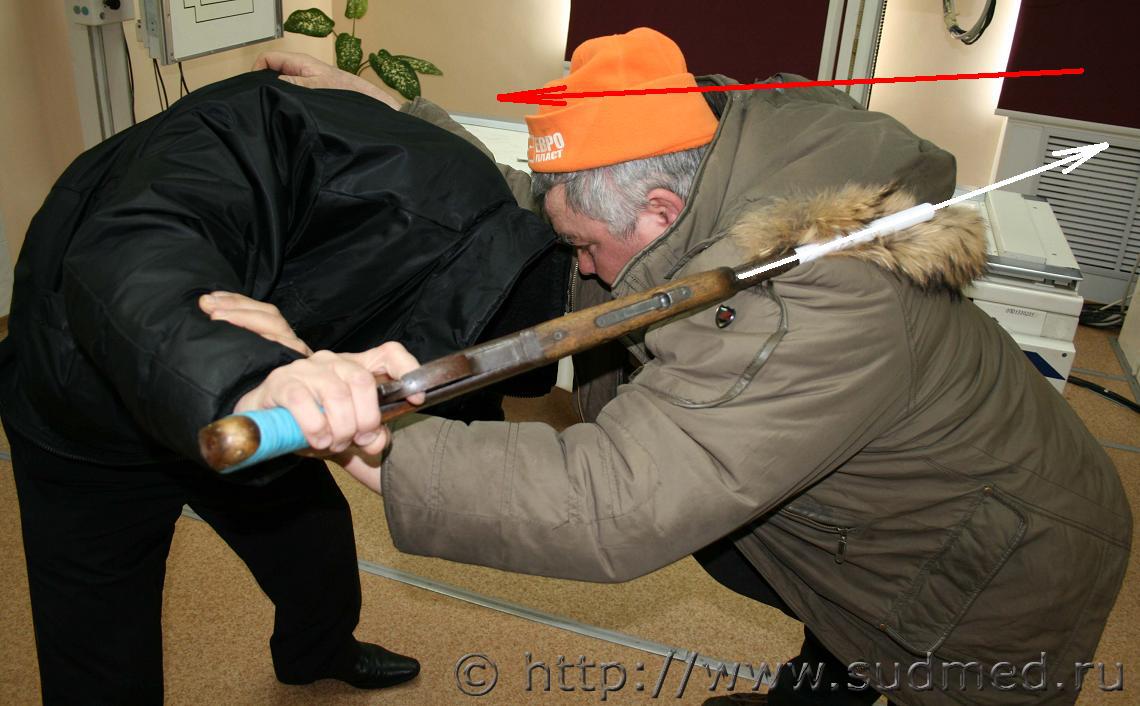 Может быть, при проведении экспертного эксперимента и получите какие-то совершенно неожиданные данные. Но маловероятно. Привожу иллюстрации после ЭЭ. В оранжевой шапочке потерпевший, на первом снимке демонстрирует как он получил повреждение, наклонившись вперед, красным вектором соединены повреждения на куртке и в затылочной области. На втором снимке подозреваемый показывает как во время борьбы выстрелил в потерпевшего. |