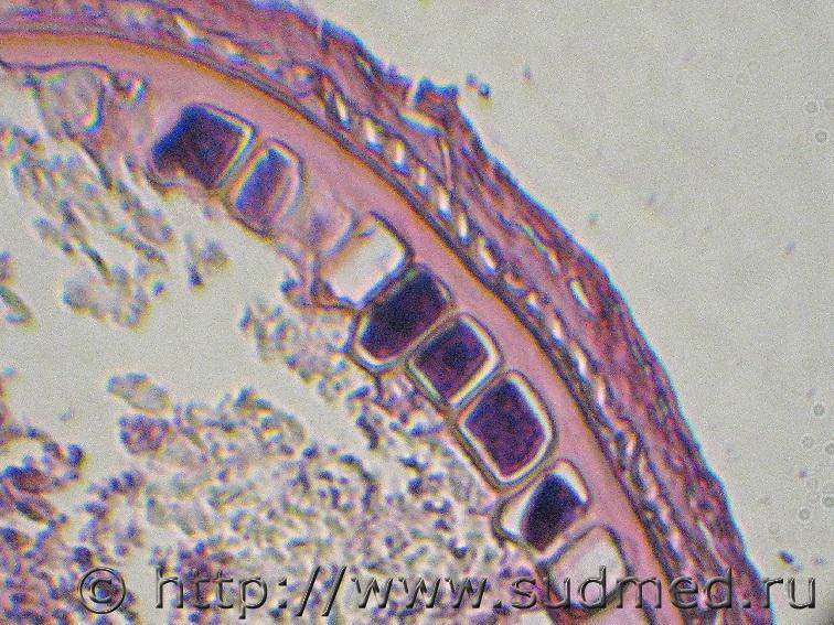 да про шовный материал я то и не думал.. Но мало ли сейчас используется микротрубок, микроэндопротезов и т.п. Меня очень сильно смущают прямоугольного вида фенестры и находящиеся в них включения в том слое, который мог бы по идее быть оболочкой... Да,согласен. Уж оч-чень похоже на чью-то кутикулу... У меня пока аналогичное мнение. |