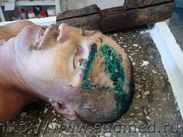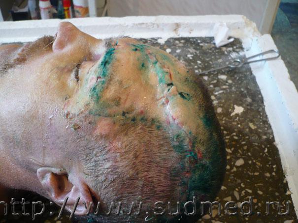 Учитывая представленные краткие сведения о пути мужика в морг с места его обнаружения и виды на представленных фото можно придти к следующему: 1. прошел достаточный срок для заживления повреждений (2 недели), и вполне возможно что часть их ко времени исследования утрачена ; 2. исследование одежды в данном случае не даст сведений о механизме формирования ЧМТ, хотя само исследование одежды быть должно проведено; 3. медико-криминалистическое исследование изъятого свода черепа (при отсутствии значительной части фрагментов, удаленных на операции) не принесёт ожидаемого результата; 4. судя по видам повреждений, составляющих комплекс ЧМТ- данная травма могла возникнуть при сдавлении головы в боковом направлении (при фиксации головы на её правой боковой поверхности- правая височная область и действии травмирующего предмета в левую лобно- височную область) - а уж данный механизм мог быть при различных обстоятельствах; 5. образование ссадин произошло- ну это всем известно- в результате действия травмирующего предмета под острым углом к поверхности кожи описанных областей . |