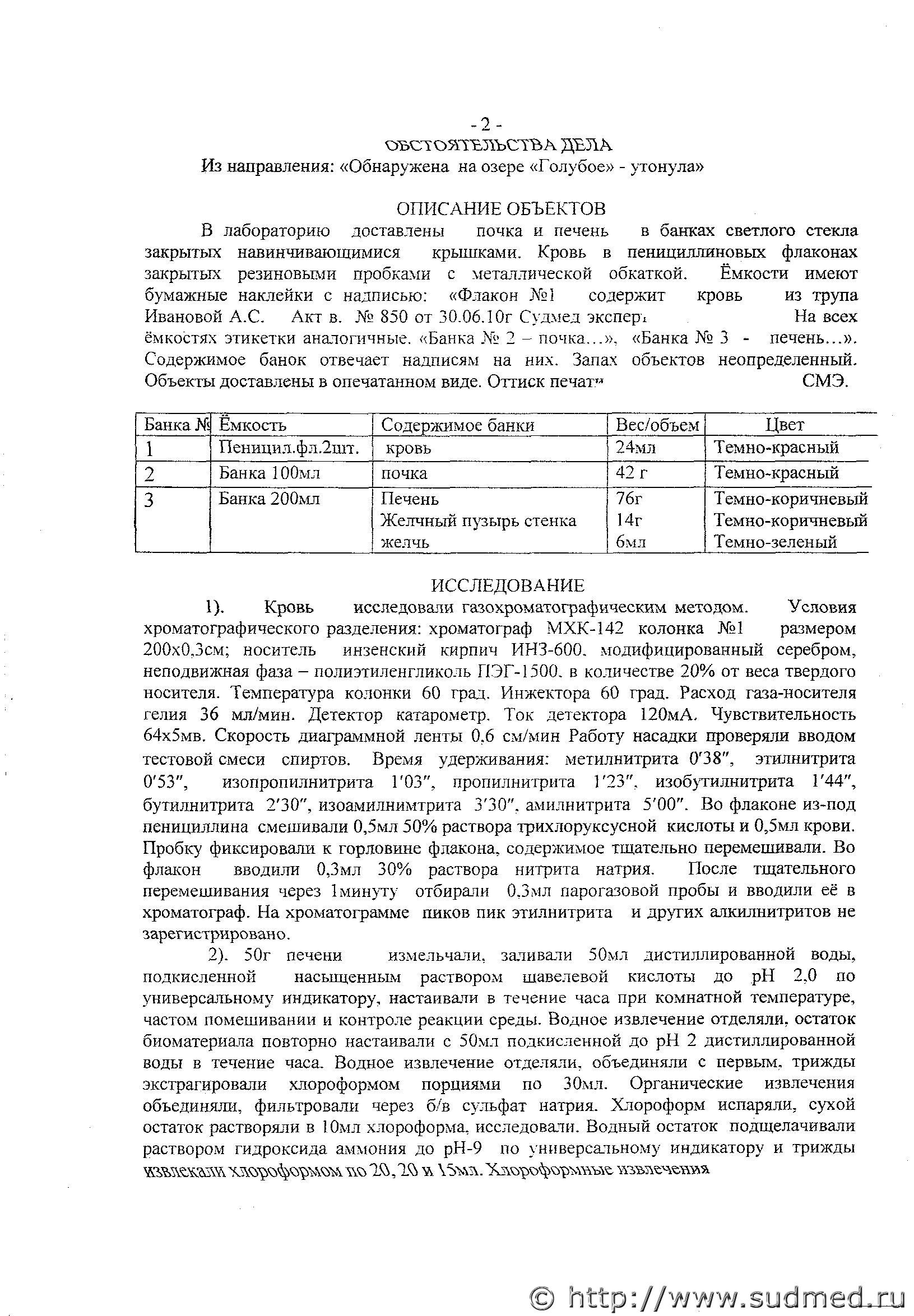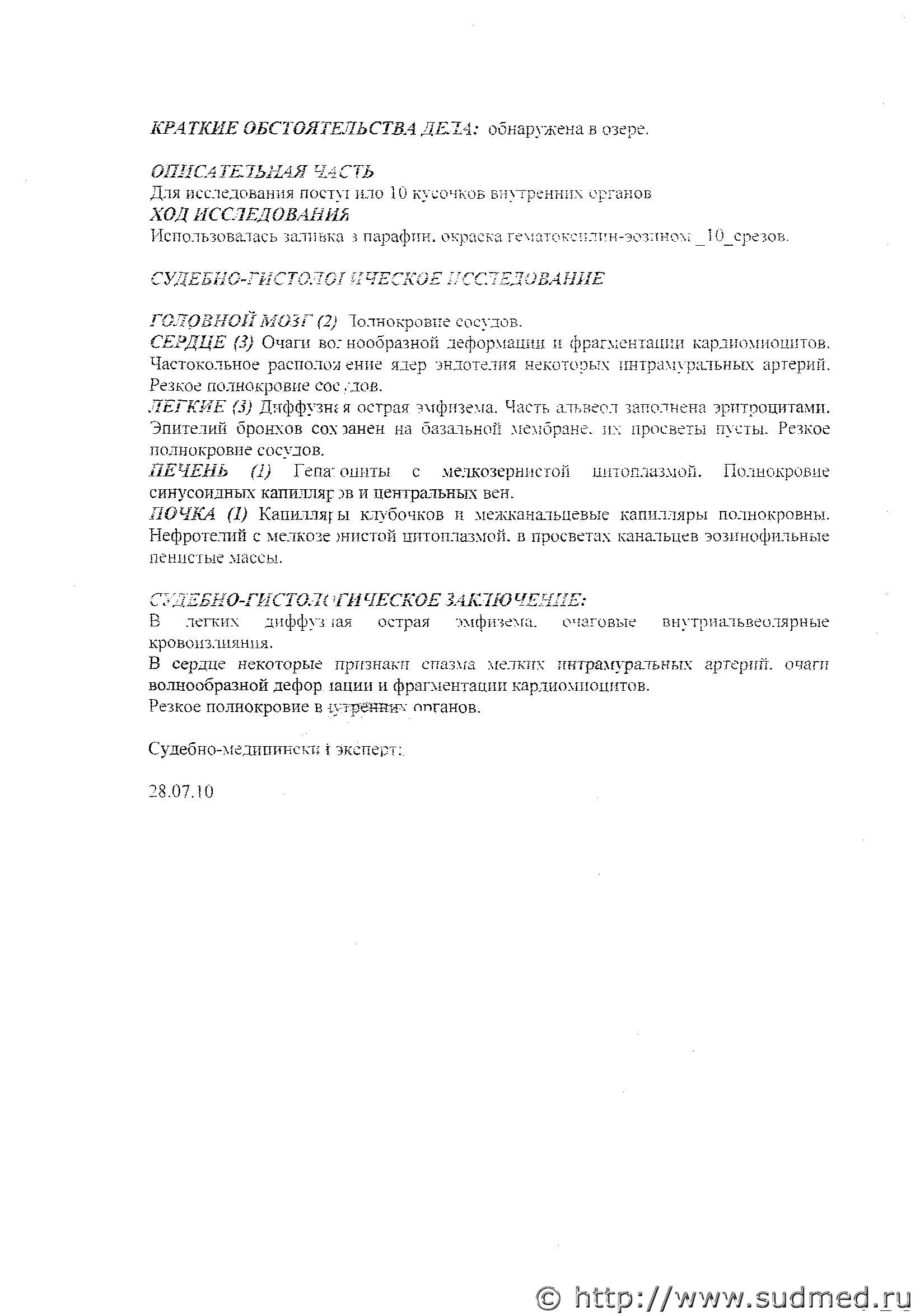 Не читая протокола (на мой взгляд - совершенно не нужен) отвечу на некоторые вопросы. И мужчкие трупы и женские всплывают, обычно, спиной вверх, т.к. их расположение в воде -б согнутое положение спина наверху. Труп может быть перевернут течением или неравномерным распределением трупных газов (при выраженом гниении). Никогда у трупа не ,.бывает полного заполнения бронхов и трахеи водой. Это чья-то выдумка, не умная. всплытие трупа начинается при развившихся процессах гничения, т.е. при температуре 10-14град - это не раньше 2-3 недель. Вопросы изучения одежды - вне нашей компетенции. Вопрос к криминалистам (сразу предупреждаю - не ответят, т.к. таких разработок и у них нет). Простите пожалуйста, я уточню. Т.е. труп в течении 2-3 после утопления в воде стоячей никак не всплывет? Я это тоже говорила следователю, но он на слово поверил подозреваемому в том, что моя дочь сама утонула и тут же всплыла. Ну что же мне делать????  |
