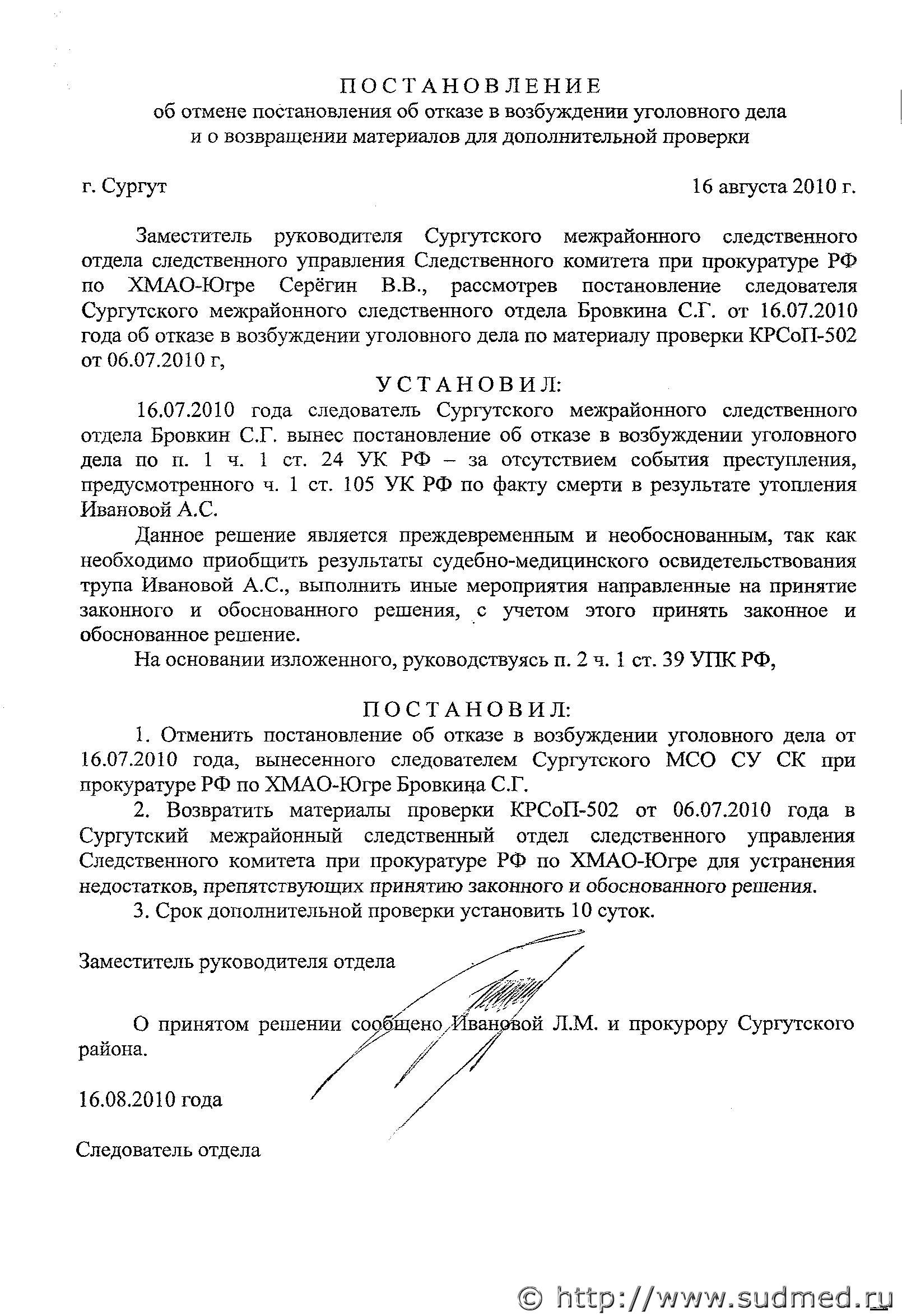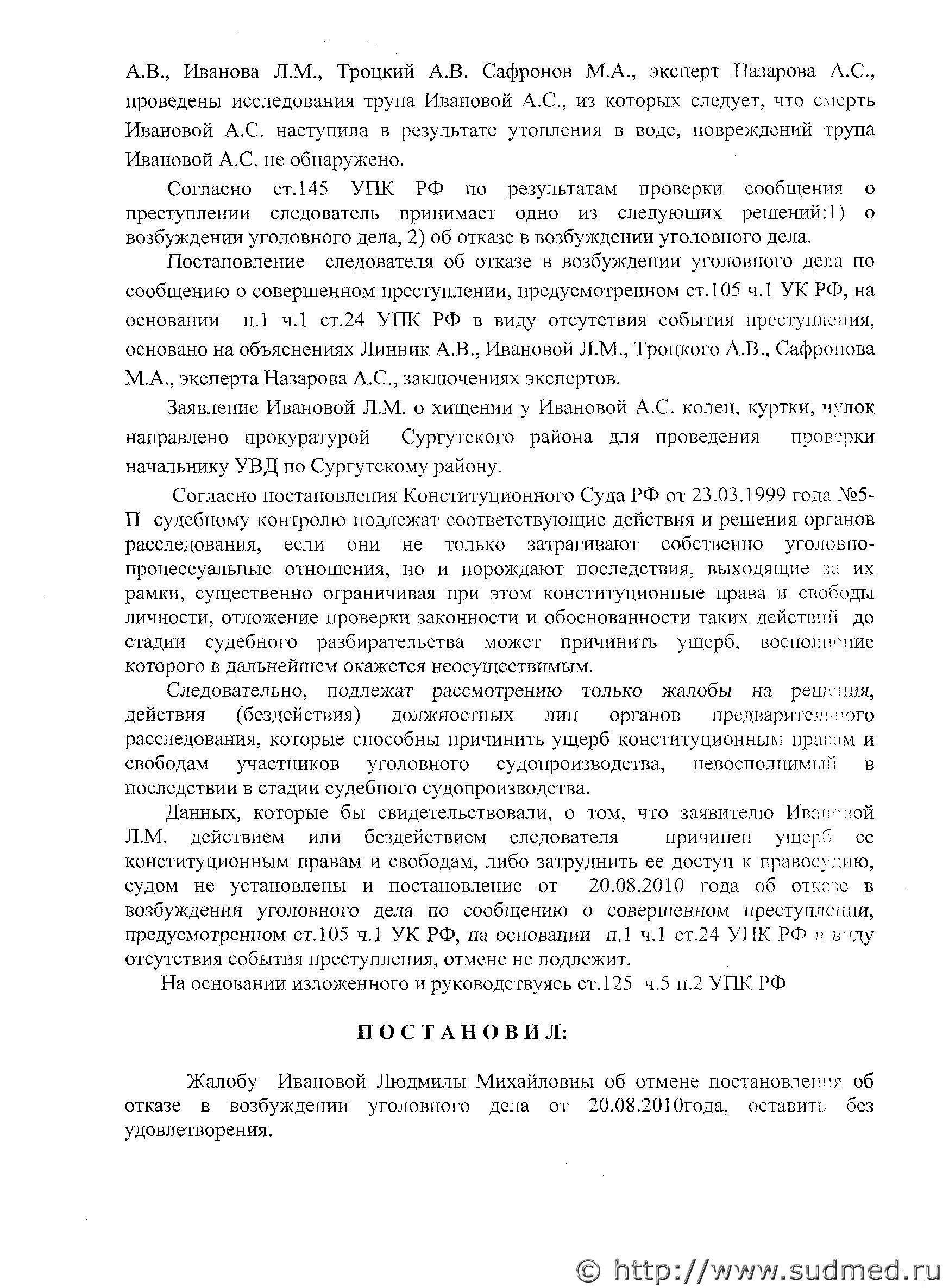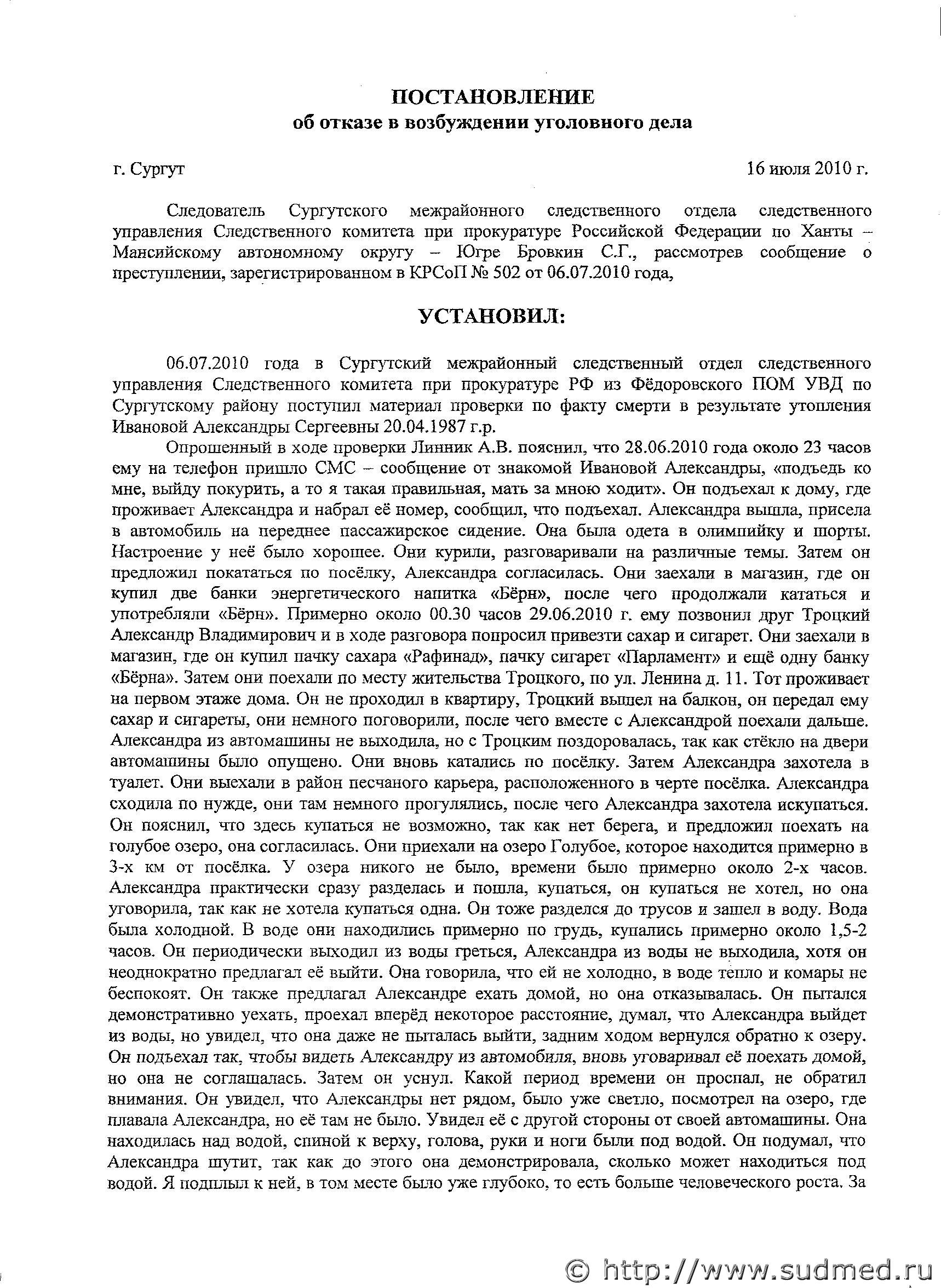 Вот моя жалоба в окружной суд. Здесь изложены все факты. Судите сами. 20.08.2010 г. я обратилась с жалобой в Сургутский районный суд на постановление следователя Бровкина С. Г. об отказе в возбуждении уголовного дела от 20.08 2010 г. по факту смерти моей дочери Ивановой Александры Сергеевны, Заместитель прокурора Никитин М. В. пояснил, что оснований для отмены постановления по факту утопления моей дочери не имеется, так как некоторые факты не были указаны мной на допросе. Меня допрашивали два раза, первый раз в день похорон, второй раз через две недели. Я в это время была в сильнейшем стрессовом состоянии и отвечала только на наводящие вопросы и, следовательно, добавить имеющиеся факты была просто не в состоянии. Через некоторое время я смогла добавить факты, но следователь просто отмахнулся, сказав, что вызовет в другое время, но так и не вызвал, а закрыл дело. Ведь собирать факты, справки, это работа следователя, но он никаких усилий к своим обязанностям не приложил. И теперь прокурор говорит, что уже поздно. Но ведь это смерть человека и здесь срока давности нет. Вот факты, которые я имела дополнить: Моя дочь вышла из дома 23-30 на 10 минут покурить в машине Линника А. В. в одежде: куртка, майка, шорты, чулки, кроссовки, на руках было два кольца и телефон. Но вернули только майку, шорты, кроссовки, телефон. При осмотре остальные вещи не были найдены. Я считаю, что на куртке и на чулках имеются следы преступления, поэтому их спрятали или выкинули, а кольца были сняты теми, кто утопил мою дочь. В эту ночь (именно в это время) была сильная гроза, сверкала молния, гремел гром, о чем прилагаю справку с метеоцентра, вода была очень холодной, температура наружного воздуха от 17 до 19 градусов, температура воды и того ниже. Сам Линник поясняет, что вода была очень холодной и, купаясь вместе с моей дочерью два часа, выходил несколько раз греться, а она все сидела в воде и не замерзала. А когда он уснул в машине, она еще купалась несколько часов. Как может совершенно адекватный и трезвый человек (что не имеется ни в крови, ни в печени, ни в почках никаких наркотических и алкогольных средств подтвердила экспертиза) купаться несколько часов подряд, не вылезая из ледяной воды? У самого Линника никакой экспертизы не проводили вообще. Кроме одной объяснительной с него ничего не взяли. И на основании этой объяснительной вынесли постановление об отказе в возбуждении уголовного дела. Так кто же признается добровольно, тем более все так гладко для него прошло. Не была изъята оставшаяся одежда моей дочери на экспертизу для того, чтобы установить – была ли одежда в озере, осмотрели ее только визуально. А моя дочь была утоплена в одежде. Куртка, скорее всего не высохла с 05-00 до 14-00 часов и была спрятана, поэтому при осмотре не нашли. Еще факт, который я сразу не могла показать, так как повторяю, была в очень плохом состоянии. Дочь вышла из дома 23-30, я ей позвонила примерно 00-15, она спокойно сказала, что уже идет домой, утром на работу. Значит, никуда не собиралась ехать. Затем я уснула, проснулась около 03-00 часов от тревоги, посмотрела, а дочери нет дома. Стала ей звонить, но телефон ее был недоступен (это я изначально не сказала, так как всех деталей не помнила из-за моего состояния). Стала звонить на другой телефон (у нее их два), звонок шел, но никто не брал трубку. Впоследствии оказалось, что второй 