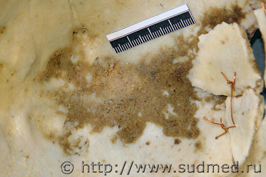Речь идет о т.н. "эффект Мальцева" - внедрение фрагментов волос и нитей ткани головного убора в фолькмановыи и гаверсовы каналы наружной компактой пластинки 1.А если пострадавший лысый и без головного убора ? 2.А если повреждения нанесены посмертно, труп с волосами на голове или в головном уборе?Будет присутствовать "эффект Мальцева",но это же в таком случае не свидетельствует о прижизненности повреждений. |