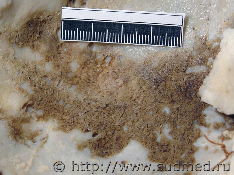 Закон парных случаев продолжает работать, поэтому добавлю иллюстраций по этой теме. Следующая экспертиза: объект исследования - свод, черепно-мозговая травма получена в начале декабря 2010 года, далее 40 дней в нейрохирургическом отделении, после констатирована смерть. Из заключительного клинического диагноза: Вдавленный многооскольчатый перелом теменно-затылочной области. Ушиб головного мозга тяжелой степени. Пластинчатые оболочечные гематомы теменно-затылочных областях с двух сторон. Ушибы мягких тканей головы, кровоподтеки лица. … Отек головного мозга, отек дислокация ствола головного мозга». На чешуе правой теменной кости «старый» дефект овальной формы, закрытый пластическим материалом, по краям данного дефекта сформирована замыкательная костная пластинка. На внутренней поверхности у края данного дефекта кости мелкие костные образования (см. пятое фото) по типу сетчатой ППР (посттравматической периостальной реакции). Другие костные образования, расположенные в области трещин перелома, отличаются как цветом, так и структурой (фото №№1-4), и по всей видимости представляют ППР перелома со сроком переживаемости 40 суток. Эскизы прикрепленных изображений |