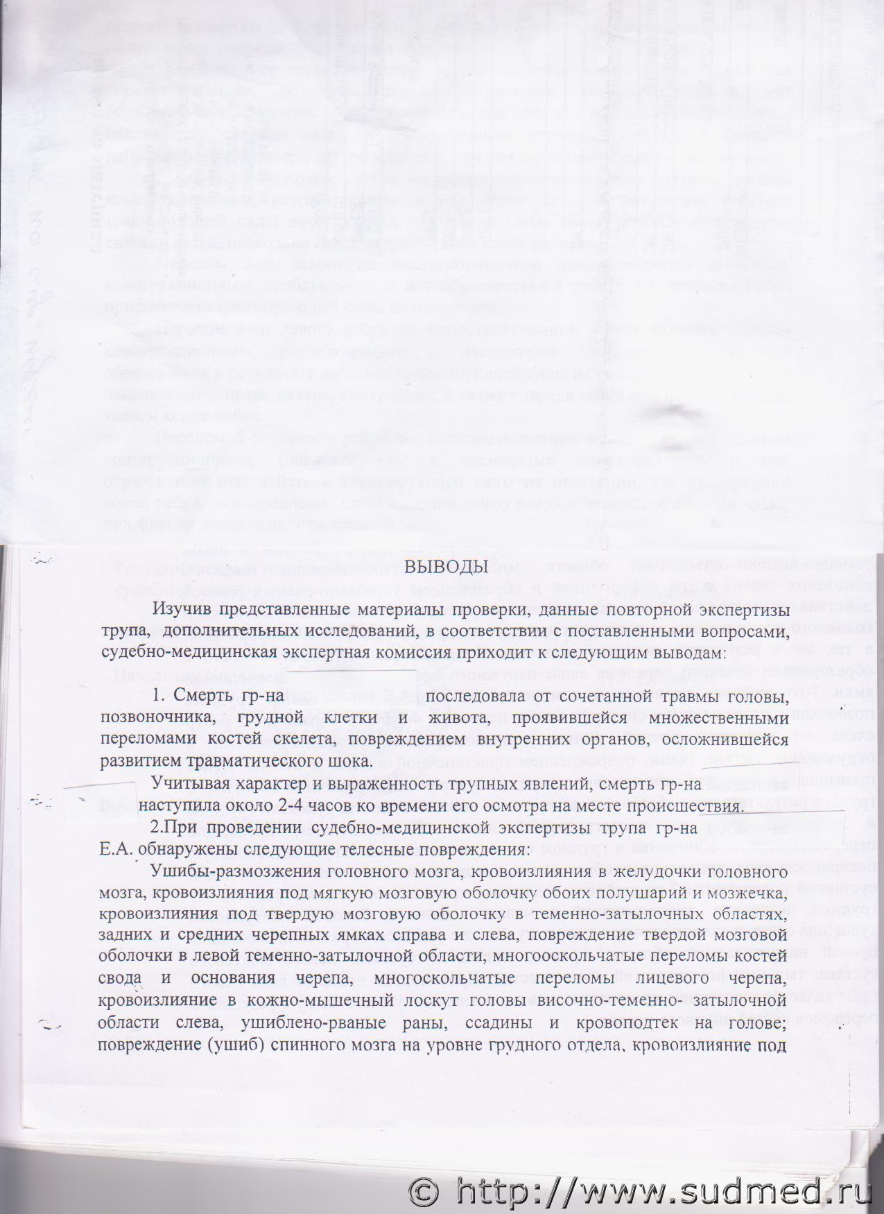 1. К каким заключениям пришли повторные комиссии? 2. Выложите полный текст протокола первичного вскрытия. 3. Изложите обстоятельства дела, в частности, уточните - проезжают ли в месте падения грузовые автомашины. На 1 и 2-й вопросы прилагаем заключения с кратким изложением обстоятельств дела. Из материалов проверки: "... Я услышал глухой удар. Вышел на улицу, увидел лежащим на земле мужчину. Я увидел, что из головы мужчины идет кровь. Каких-либо признаков жизни мужчина не подавал. После этого я позвонил по телефону 103 и сообщил о случившися". Из карты вызова СМП: "... Время приянтия вызова - 0.44. Выезда на вызов - 0.45, прибытия на место -в 0.55.... В 0.55 осмотрен труп мужчины. при осмотре обнаружена обширная ЧМТ...., отсутствие сердечной деятельности, артериального давления нет на крупных сосудах, реакции зрачков на свет нет... Констатирована смерть от обширной ЧМТ". Для информации: из направления на медосмотр - вредные условия: работа на высоте, вибрация, пыль, шум. Из характеристики рабочего места: по окончании работы дозировщик производит очистку бетоносмесителей, раздаточных телег, вагонеток от остатков бетонной смеси. По имеющейся не подтвержденной документально информации, потерпевшего придавило вагонеткой от неумышленного включения линии по приготовлению бетонной смеси. О чем неоднократно указывали родители погибшего в своих обращениях в правоохранительные органы. Для достоверности информации прилагаем фотоснимки костных останков. 1. К каким заключениям пришли повторные комиссии? 2. Выложите полный текст протокола первичного вскрытия. 3. Изложите обстоятельства дела, в частности, уточните - проезжают ли в месте падения грузовые автомашины. Дополнительно к ранее отправленному сообщению направляю протокол первичного вскрытия. В месте падения грузовые автомашины не проезжают. 1. К каким заключениям пришли повторные комиссии? 2. Выложите полный текст протокола первичного вскрытия. 3. Изложите обстоятельства дела, в частности, уточните - проезжают ли в месте падения грузовые автомашины. Дополнительно направляю остальную часть протокола первичного вскрытия. Эскизы прикрепленных изображений |