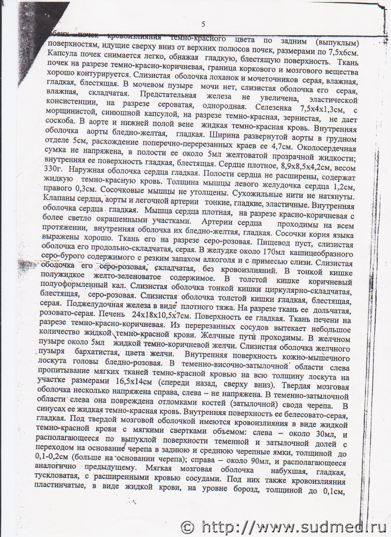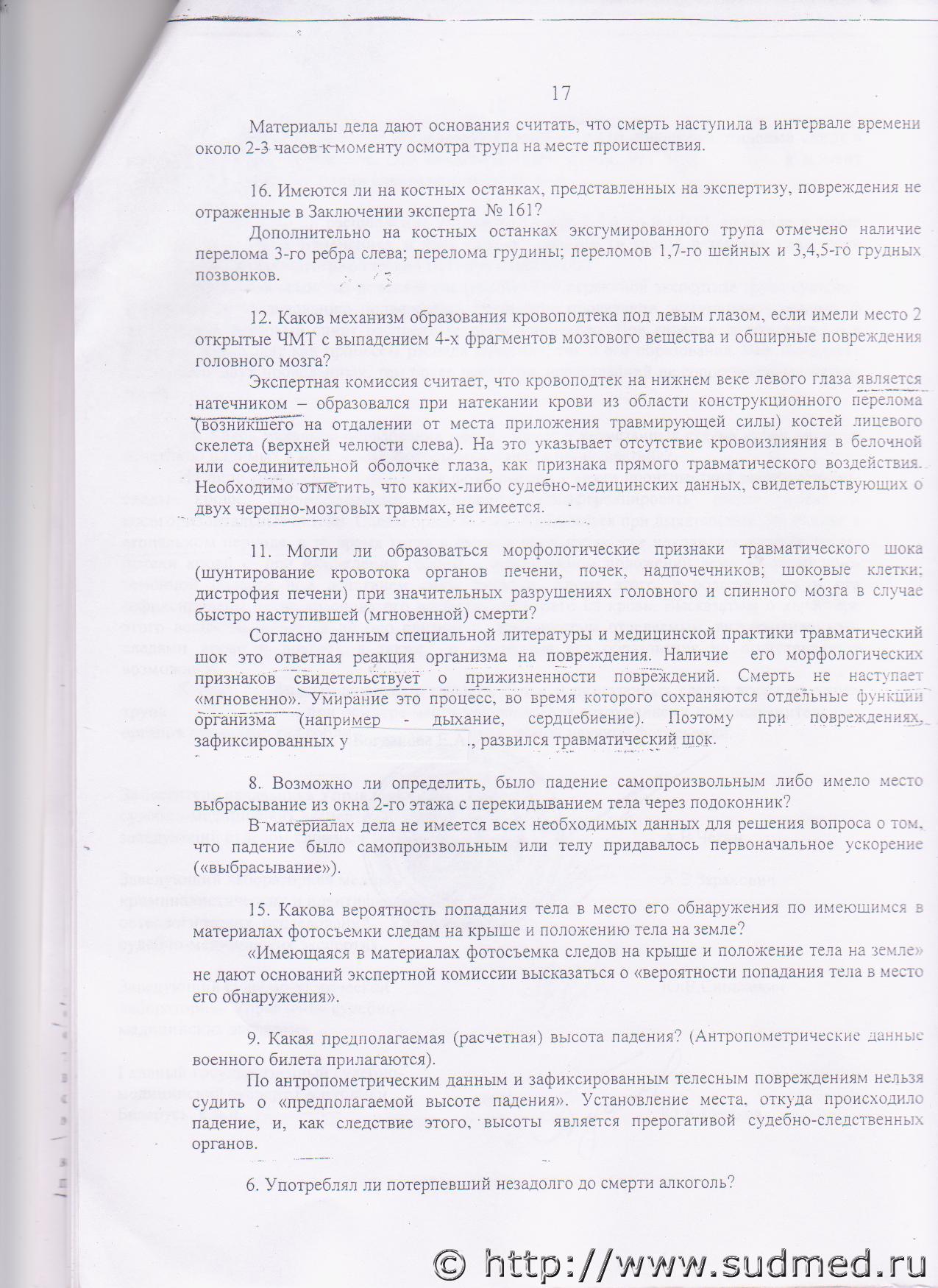 На основании представленных материалов первичной судмедэкспертизы трупа и выводов повторных комиссионных судмедэкспертиз, а также обстоятельств дела, при этом ни в коем случае не злоупотребляя свободным от основной работы временем судмедэкспертов, просьба ответить на следующие вопросы: 1. Какова вероятность образования кровоизлияний и кровоподтеков описанных в выводах повторной судмедэкспертизы эксгумированного трупа (кровоизлияния в желудочки головного мозга; кровоизлияния под мягкую мозговую оболочку обеих полушарий мозжечка; кровоизлияния под твердую мозговую оболочку в теменно-затылочных областях; кровоизлияние в кожно-мышечный лоскут головы височно-теменно-затылочной области слева; ссадины и кровоподтек на голове; кровоизлияние под твердую мозговую оболочку спинного мозга на уровне 2-5 грудного позвонка; кровоизлияние над твердой мозговой оболочкой на уровне 1-7 грудного позвонка; кровоизлияния в мышцы спины на уровне 7-шейного -8 грудного позвонка; кровоизлияния в области перелома рукоятки грудины и боковой поверхности грудной клетки слева; кровоизлияния в околопочечную клетчатку обеих почек; кровоизлияния в мягкие ткани боковой поверхности туловища слева; кровоподтек нижнего века левого глаза) в случае, когда кровяное давление падает резко практически до нуля, при обширной открытой ЧМТ с выпадением фрагментов мозгового вещества? 2. Какая вероятность в данном случае образования морфологических признаков травматического шока? (распространенные нарушения кровообращения в головном и спинном мозге с микротромбами, периваскулярными геморрагиями, ишемией нервных клеток, отеком; распространенный спазм артерий и венозное полнокровие внутренних органов с депонированием крови в сосудах микроциркуляции; шунтирование кровотока в надпочечниках, печени, поля шоковых клеток в печени; очаговый отек, острая эмфизема легких; дистрофические изменения внутренних органов). 3. Какова вероятность образования всех повреждений имеющихся на трупе от одного травматического воздействия при прямом свободном падении с высоты 3-х этажного дома? 4. Могла ли иметь место в данному случае комбинированная травма с интервалом 0-6 часов? P.S. Вялiкае дзякуй Админу за честный, прямой ответ. При проведении полноценного экспертного исследования готов сотрудничать не "за спасибо". |