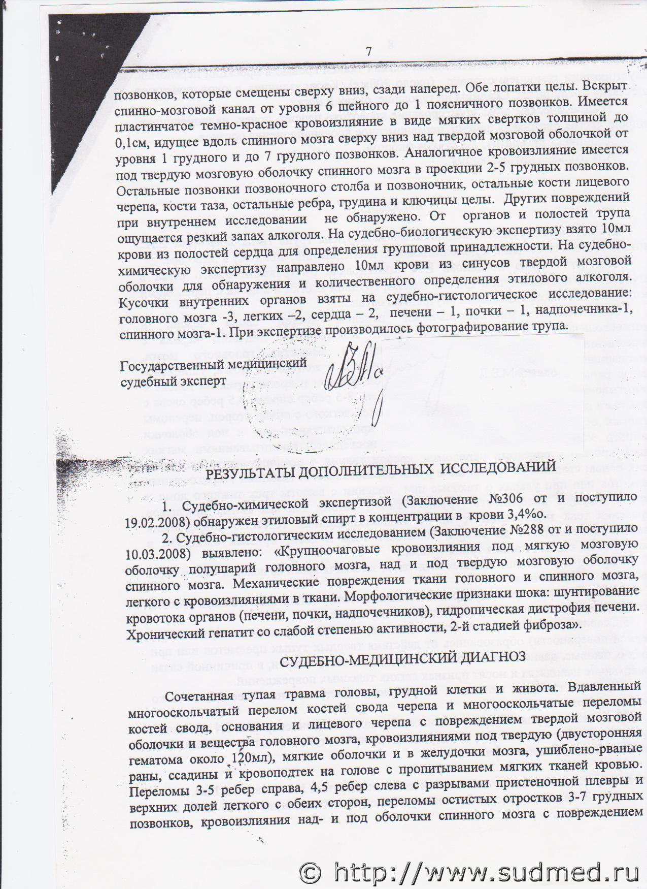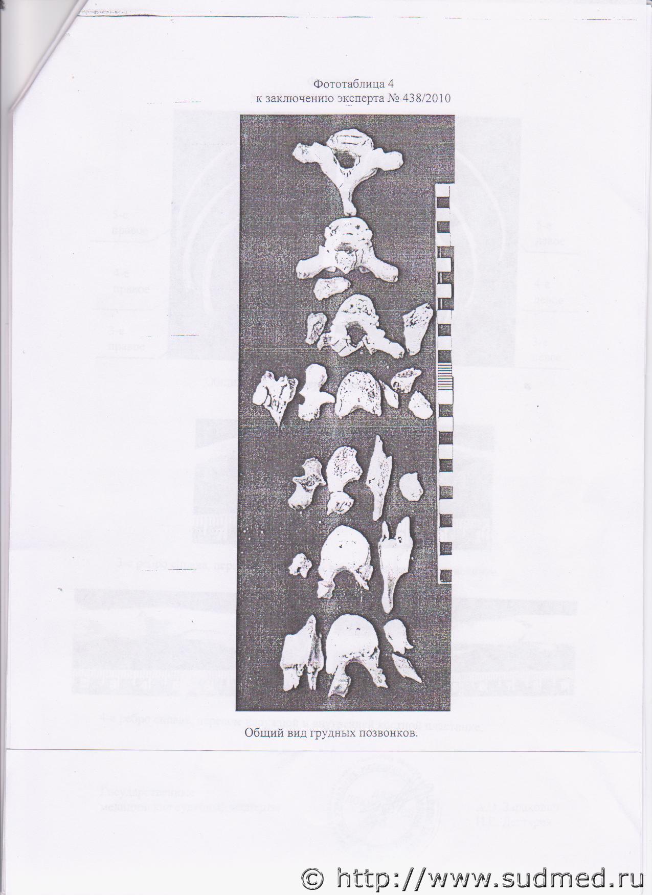 Вы специально разбиваете повреждления на группы и выкладываете их частями, чо бы повеселее было? Если причина другая - поясните. Уважаемый Filin! Весело мне было до 15 февраля 2008 года. После того, как погиб мой близкий человек, жизнь приобрела совершенно другой смысл. После проведения первичной судмедэкспертизы, повторная комиссионная экспертиза эксгумированного трупа выявила дополнительно - перелом рукоятки грудины, перелом ребра по окологрудинной линии, переломы 3-4 грудных позвонков, перелом поперечного отростка 3-го грудного позвонка. Далее следующая повторная комиссионная экспертиза по материалам дела и костным останкам выявила оскольчатый перелом 5-го грудного позвонка. Ни в одной из проведенных экпертиз в исследовательской части не отражены имеющиеся на костных останках повреждения - переломы суставного отростка грудного позвонка, переломы правых поперечных отростков грудных позвонков, переломы остистых отростков грудных позвонков у основания их и на концах. Фотоснимки этих вышеуказанных и не отраженных ни в одной из проводимых экпертиз могу предоставить. В связи с данными пояснениями, прошу ответить на ранее поставленные вопросы. |