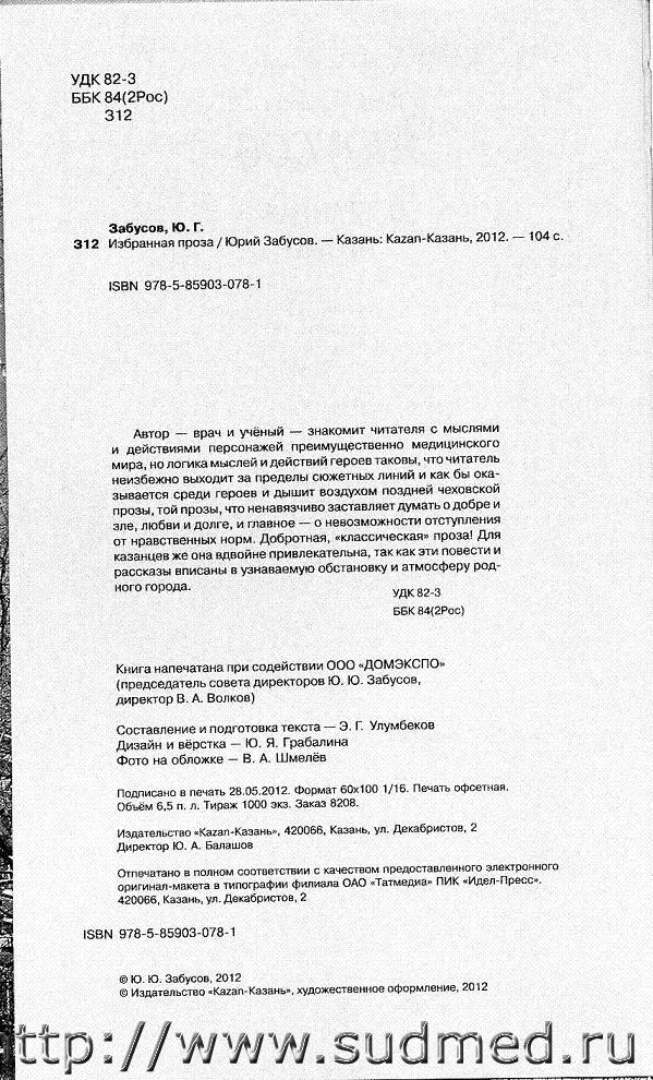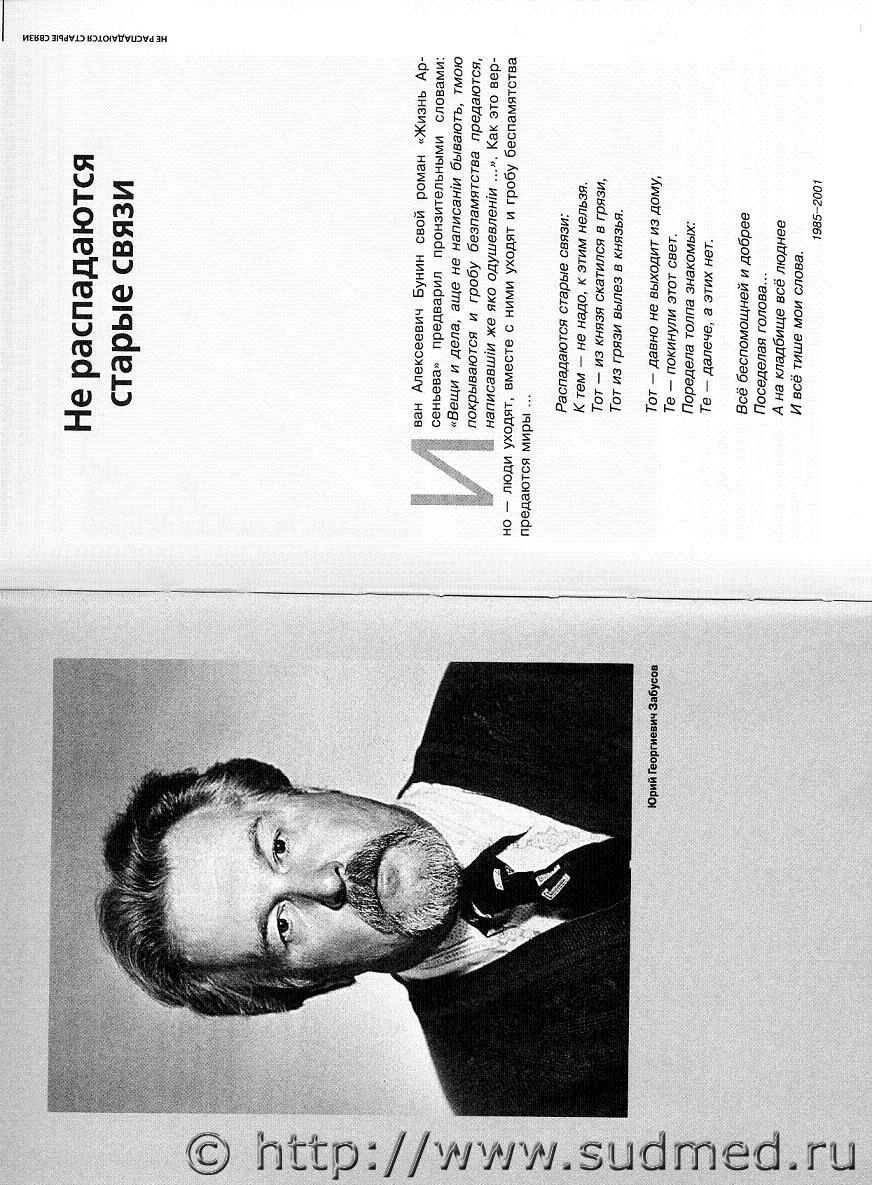 В этом году Юрию Георгиевичу ЗАБУСОВУ исполнилось бы 75 лет. Юрий Георгиевич был весьма известным и авторитетным в Казани и Татарстане судебно-медицинским экспертом и патологоанатомом, патоморфологом. Он родился в 1936 году в медицинской семье. Отец гистолог, в последствии профессор, заведующий кафедрой мединститута, мать очень известный и популярный в ту пору терапевт и фтизиатр. Детство военного времени, советская школа, потом мединститут. На 3-м курсе он прочел книгу профессора Райского «Судебная медицина» и решил посвятить себя этой дисциплине. В 1958 году Юрий Георгиевич женился по большой любви на одногруппнице, родились два сына (старший унаследовал отцовскую специальность, не проявив, однако, таких талантов). Всю жизнь Юрий Георгиевич прожил со своей супругой, очень известным в Казани невропатологом. В целом прожили хорошо, хотя и всякое бывало. По окончании института в 1960 году молодой специалист отправился работать в город Киров, где и трудился в качестве патологоанатома областной больницы и судебно-медицинского эксперта областного бюро. Всю необъятную Кировскую область изъездил он вдоль и поперек в служебных командировках, приобретя большой профессиональный и жизненный опыт. В 1964 он возвратился в Казань, был избран на кафедру патологической анатомии мединститута, защитил кандидатскую диссертацию, был ассистентом, потом доцентом, заведовал разными городскими прозектурами, был главным патологоанатомом города. Надо сказать, что он был прекрасным лектором и преподавателем, что до сих пор вспоминают его теперь весьма немолодые студенты. Активность Юрия Георгиевича в те годы была очень высока. Он успевал многое. Большое количество печатных научных трудов (более 300) по различным областям медицины – судебной медицине, патологической анатомии и физиологии, фармакологии, неврологии, нормальной гистологии, медицинской статистики, истории медицины и пр. Написан и издан был «Секционный курс». Уже была почти готова докторская диссертация. Но, увы! В те годы Юрий Георгиевич был весьма подвержен самой русской из болезней. Пьющий человек всегда очень уязвим. Потому проклятые недоброжелатели и завистники, и просто враги вынудили его в 1978 уйти с кафедры. Они же, в последствии, и помешали защите докторской диссертации. Ну и черт с ними, их и в живых уже почти нет никого. Конечно же, это был облом. Порушилась научная и академическая карьера. Хотя сам виноват. И Юрий Георгиевич, будучи еще довольно молодым человеком, поступил работать в Республиканское Бюро судебно-медицинской экспертизы МЗ ТАССР, где и проработал до самого конца в 2004 году. Работа в морге у секционного стола, опергруппе, гистологические исследования, бесконечные интерны. Здесь великолепно проявился его талант блестящего диагноста и патоморфолога. Так что судебно-гистологическая служба Бюро по сути начала развиваться только с его приходом. Большую часть своего рабочего времени он оказывал консультативную помощь сотрудникам морга, экспертам гистологам, руководству, клиницистам и патологоанатомам из различных медучреждений города и республики. В последние годы его интересовали вопросы суицидологии в судебно-медицинском отношении, вопросы медицинской статистики, заболеваемость и причины смерти бездомных, были изданы печатные работы и монография. Он был очень р