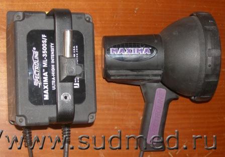 Переносной излучатель света ультрафиолетового спектра МАХІМА ML 3500 S/F, производитель фирма «Spectroline», длина волн излучения 320-400 нм. Отдельно расположенный блок питания, сама же лампа с рукояткой имеет длинный шнур. Имеется также стационарный излучатель того же производителя UV-400 (размерами с МВ-печку).