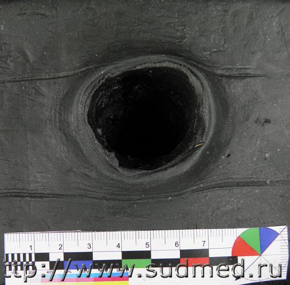 Выстрел в плотный упор. Примечание: на клеенке синим цветом отмечена проекция фрагментов ребер внутри блока: Выстрел с расстояния 10 см: Кроме того, производились выстрелы с расстояний до 1 м. Во всех случаях, включая выстрел в упор, имитатор пули разрушался на мелкие частицы еще в канале ствола, его фрагменты повреждали мед.клеенку и внедрялись в пластилин на глубину до 5 мм (см. фото), при выстреле с расстояния 10 см. Глубина раневого канала, сформированного пороховыми газами, в пластилине при выстреле в упор составила 4 см, на дне - мелкие частицы имитатора. До ребра, находившегося на глубине 5 см, повреждающие факторы выстрела не добрались. Таким образом, причинение сквозного огнестрельного ранения тела (приведенного в заявленном случае) холостым патроном, который использовался для настоящего эксперимента, невозможно. Ради интереса свинтили дульный компенсатор и постреляли без него. Эффект тот же - имитатор пули разрушается еще в канале ствола. |