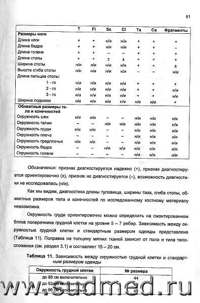 Довольно не привычная таблица. А в наши дни еще и сомнительная - по какой системе оценивается размер одежды и обуви? (российской, немецкой, американской, английской и пр.) Может придумаем что-нибудь универсальное? Не для презентаций. Для себя, для работы. То что представил, родилось в процессе подготовки к приему первых трупов, поэтому, наверняка не совершенно. |