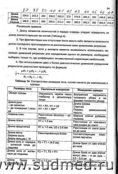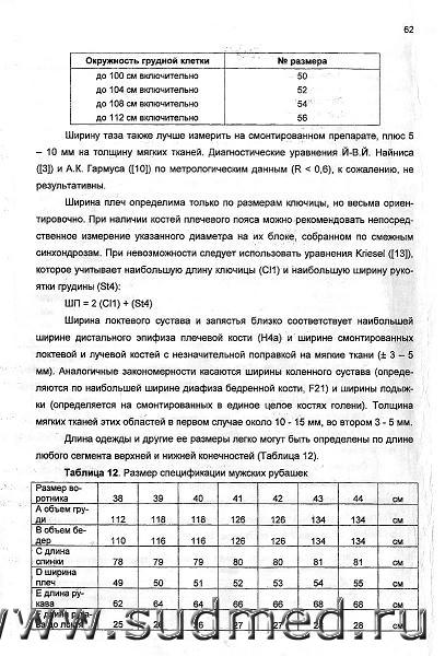 Довольно не привычная таблица. А в наши дни еще и сомнительная - по какой системе оценивается размер одежды и обуви? (российской, немецкой, американской, английской и пр.) Пользовались Новой медицинской технологией РЦ СМЭ. "Определение прижизненных соматических размеров тела человека при судебно-медицинской экспертизе скелетированных и сожженных останков" (Москва 2007). Авторы: В.Н.Звягин, О.И.Галицкая, М.А.Григорьева |