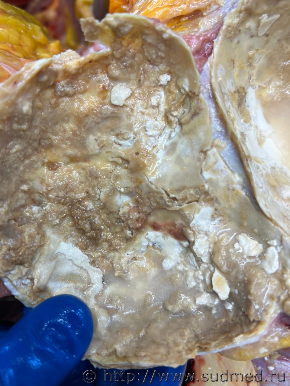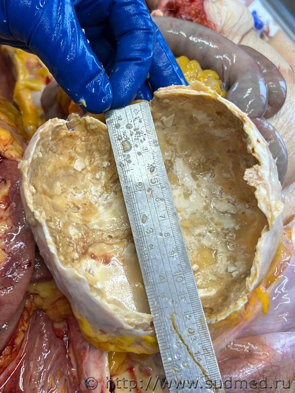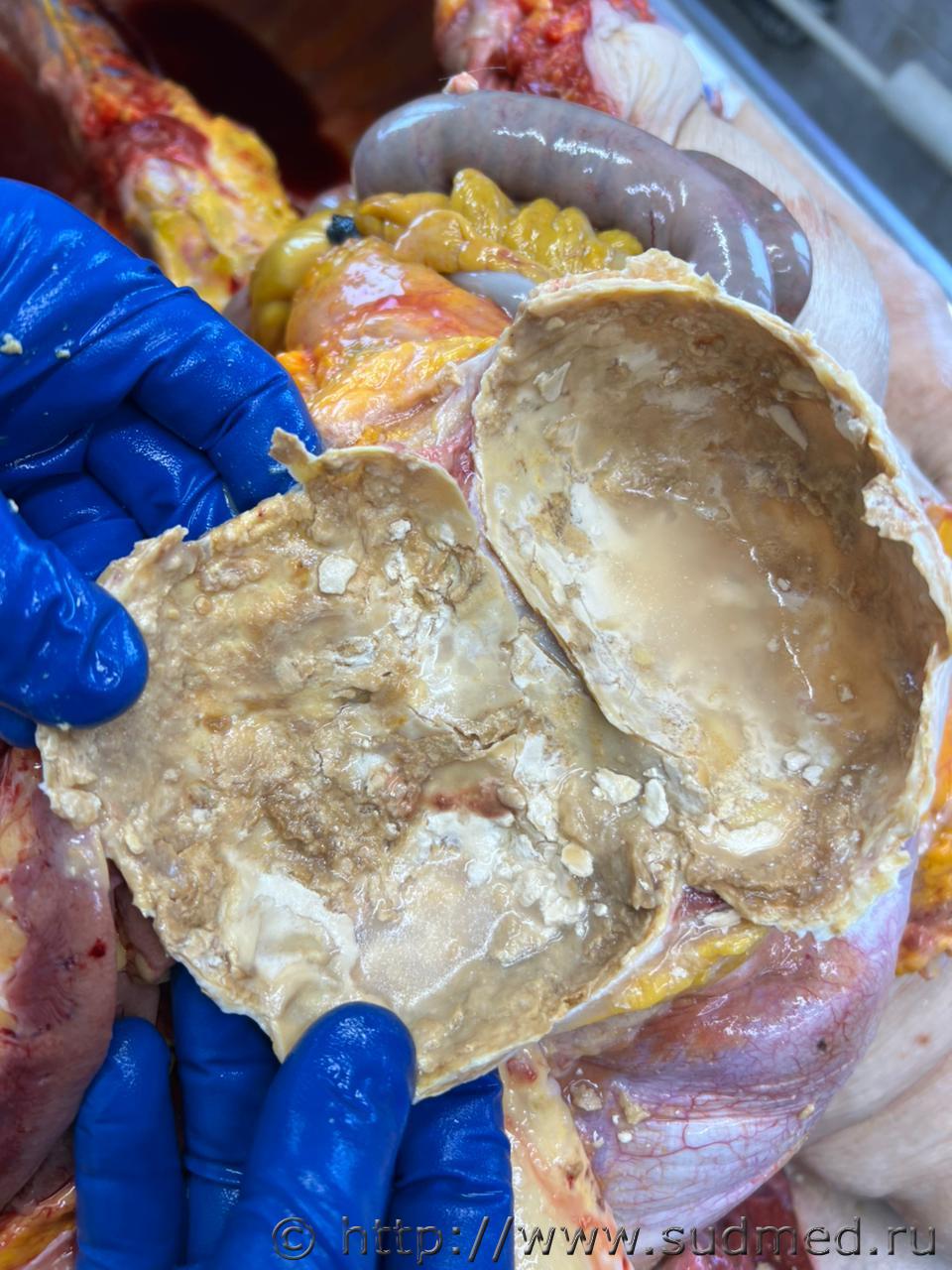 Уважаемые коллеги. Вот такая находка на секции. Женщина 75 лет, рак восходящей ободочной кишки. На фото левая почка. Оболочка этой находки (не знаю даже как ее обозвать в диагнозе) кальцинирована, просвет был заполнен белесовато-серо-желтыми, кашицеобразной и полужидкой консистенции бесструктурными массами. Паренхима почки на нижнем полюсе в виде небольшого фрагмента. Кто встречал такое? Как обозвать данную находку в диагнозе? З.Ы. Простите, что большая часть фото без линейки ((( И снова ошибка при открытии фото… |