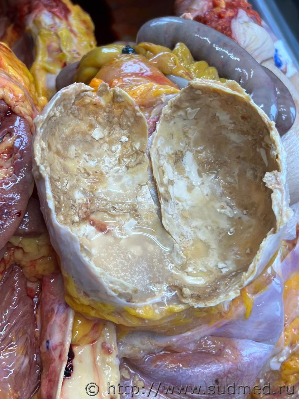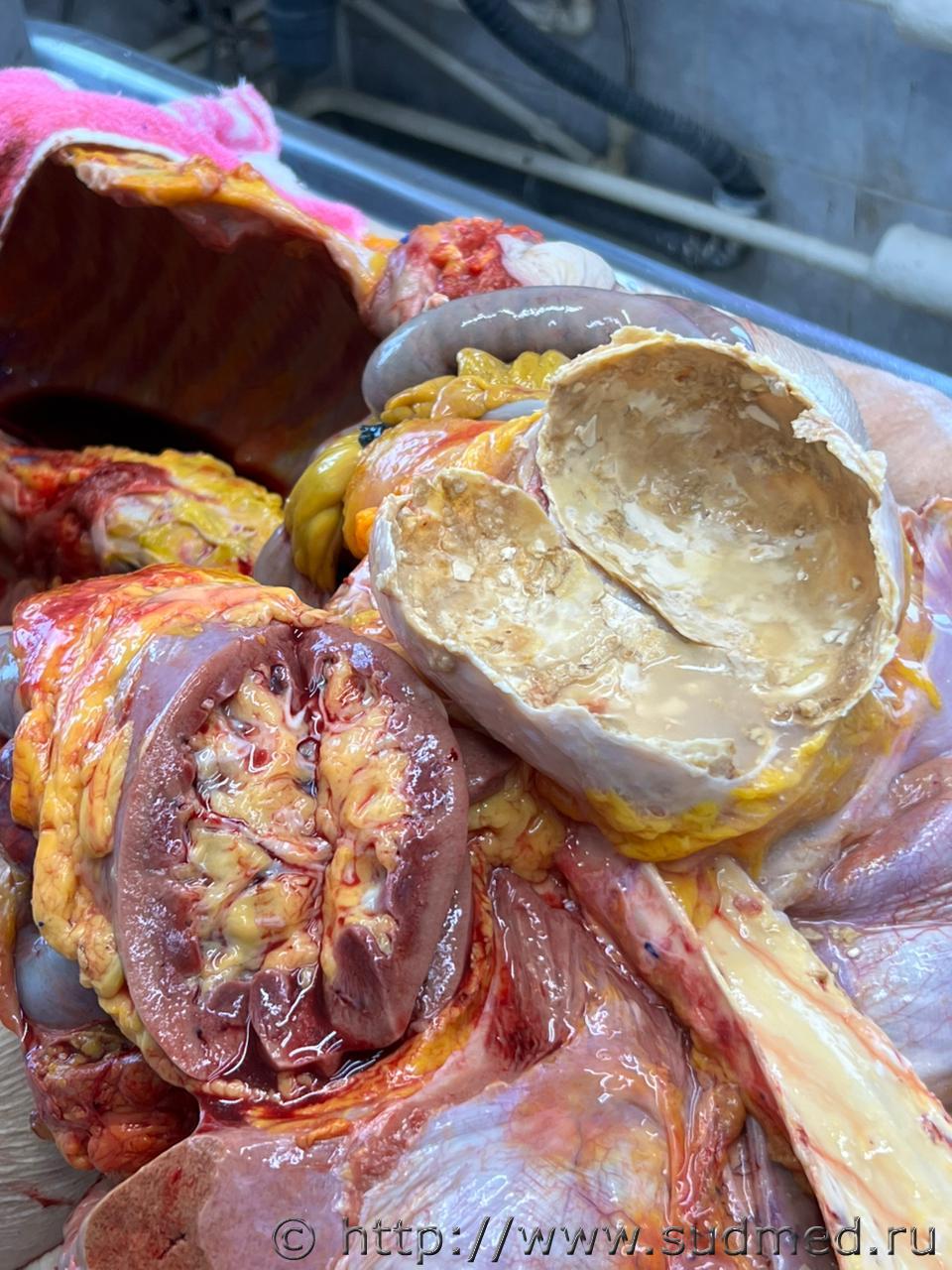 Уважаемые коллеги. Вот такая находка на секции. Женщина 75 лет, рак восходящей ободочной кишки. На фото левая почка. Оболочка этой находки (не знаю даже как ее обозвать в диагнозе) кальцинирована, просвет был заполнен белесовато-серо-желтыми, кашицеобразной и полужидкой консистенции бесструктурными массами. Паренхима почки на нижнем полюсе в виде небольшого фрагмента. Кто встречал такое? Как обозвать данную находку в диагнозе?