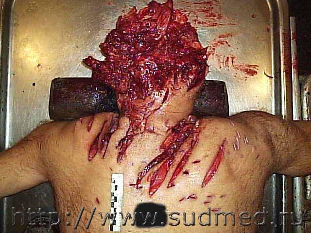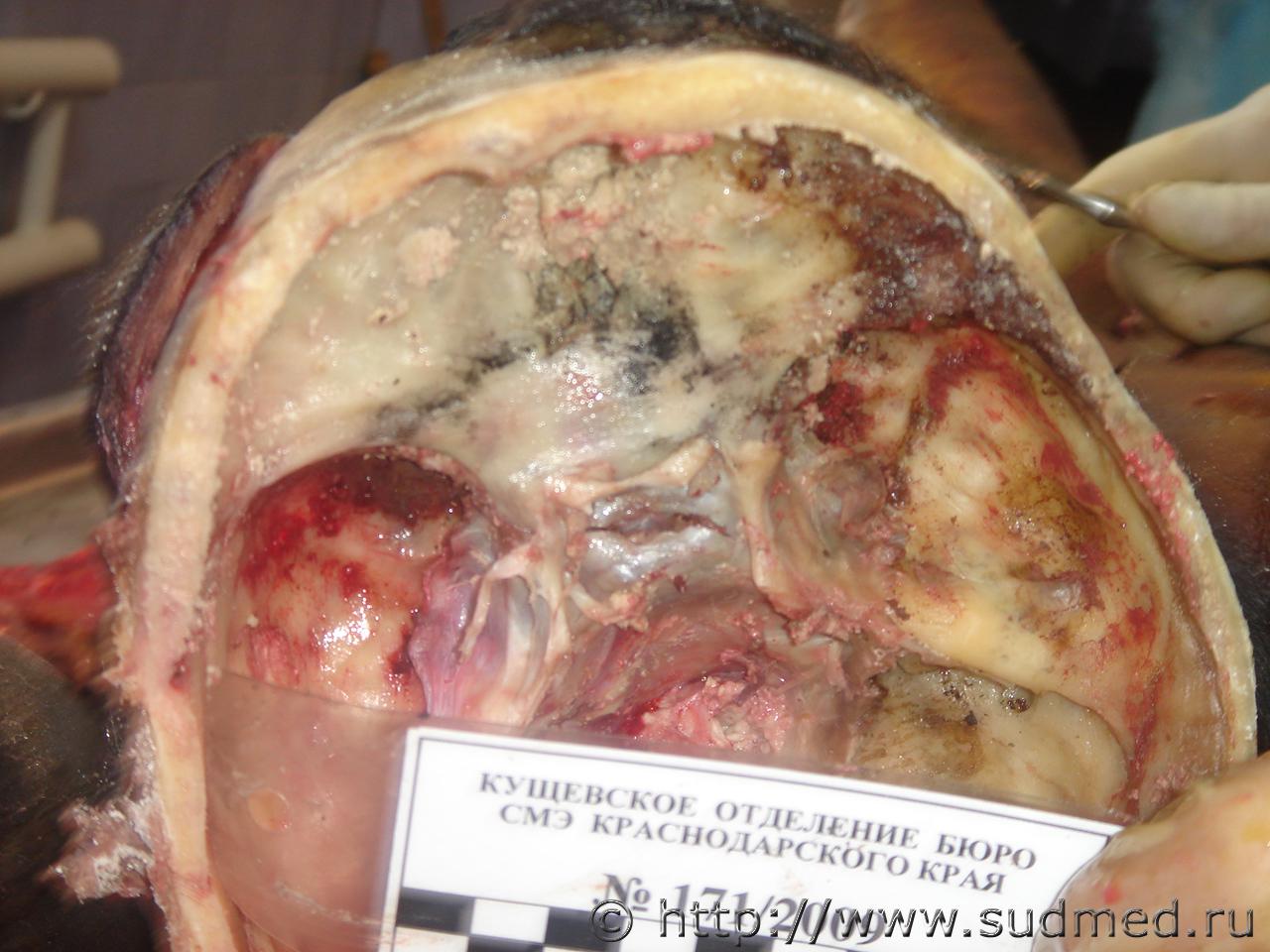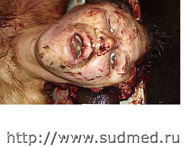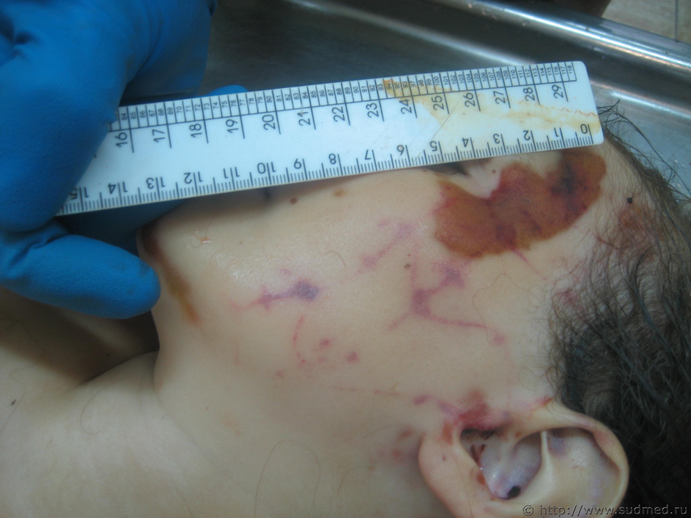Вчера проводил исследование трупа девочки 6 лет, с предварительных данных при перебегании дороги была сбита легковым автомобилем с прицепом (контакт ребёнка был с прицепом) на левой половине лица отпечаток протектора колеса, справа осаднение прямоугольной формы(крыло) перелом костей основания и свода черепа по типу сжатия между двумя тупыми предметами (переезд исключается однозначно), добаляю фото. ![]() |