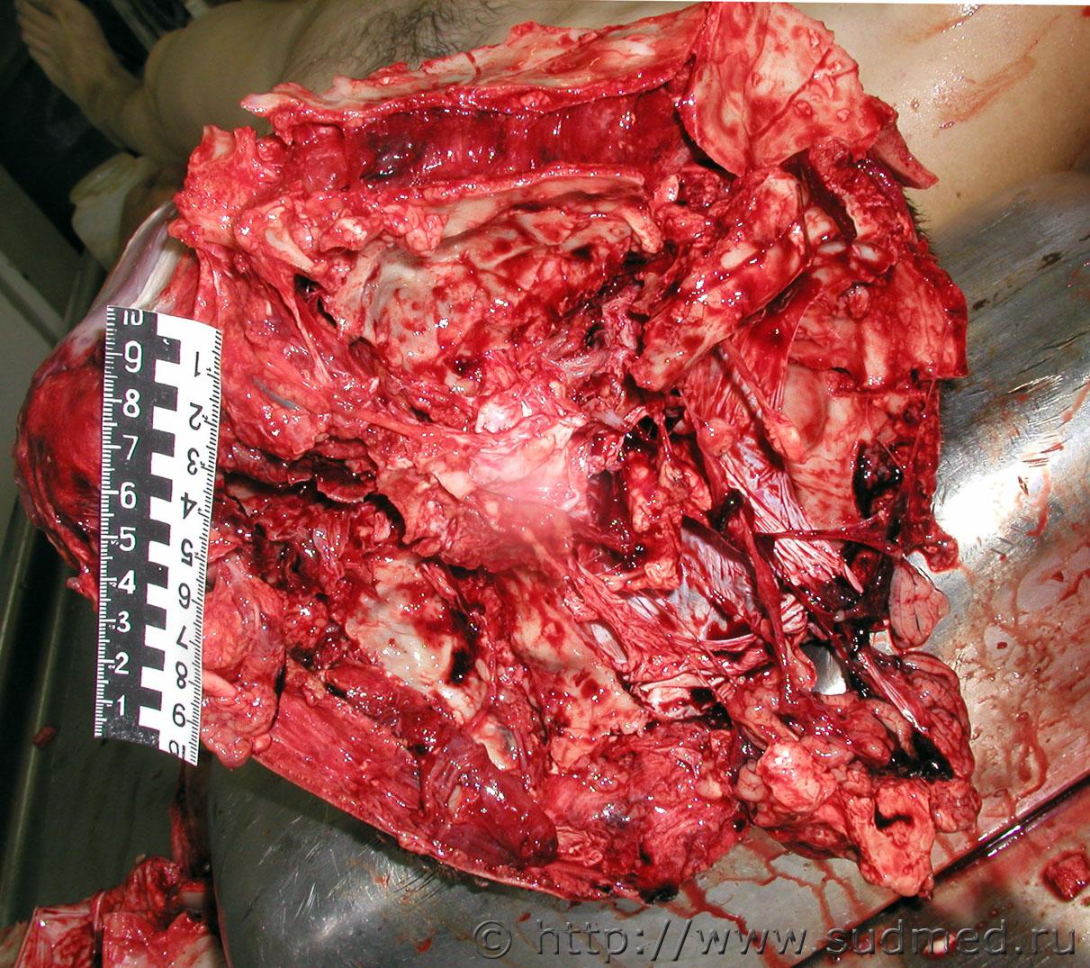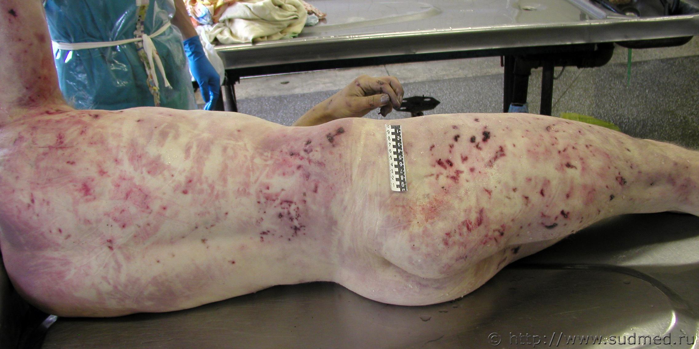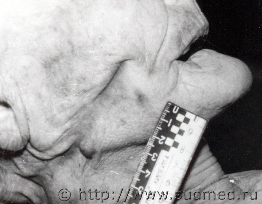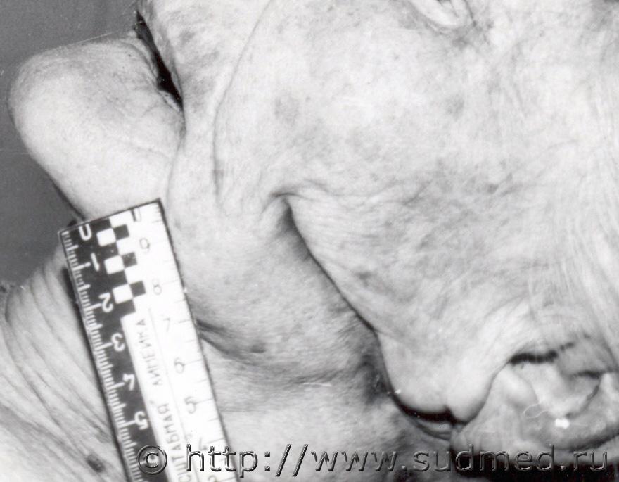 Вчера проводил исследование трупа девочки 6 лет, с предварительных данных при перебегании дороги была сбита легковым автомобилем с прицепом (контакт ребёнка был с прицепом) на левой половине лица отпечаток протектора колеса, справа осаднение прямоугольной формы(крыло) перелом костей основания и свода черепа по типу сжатия между двумя тупыми предметами (переезд исключается однозначно), добаляю фото. ![]() |