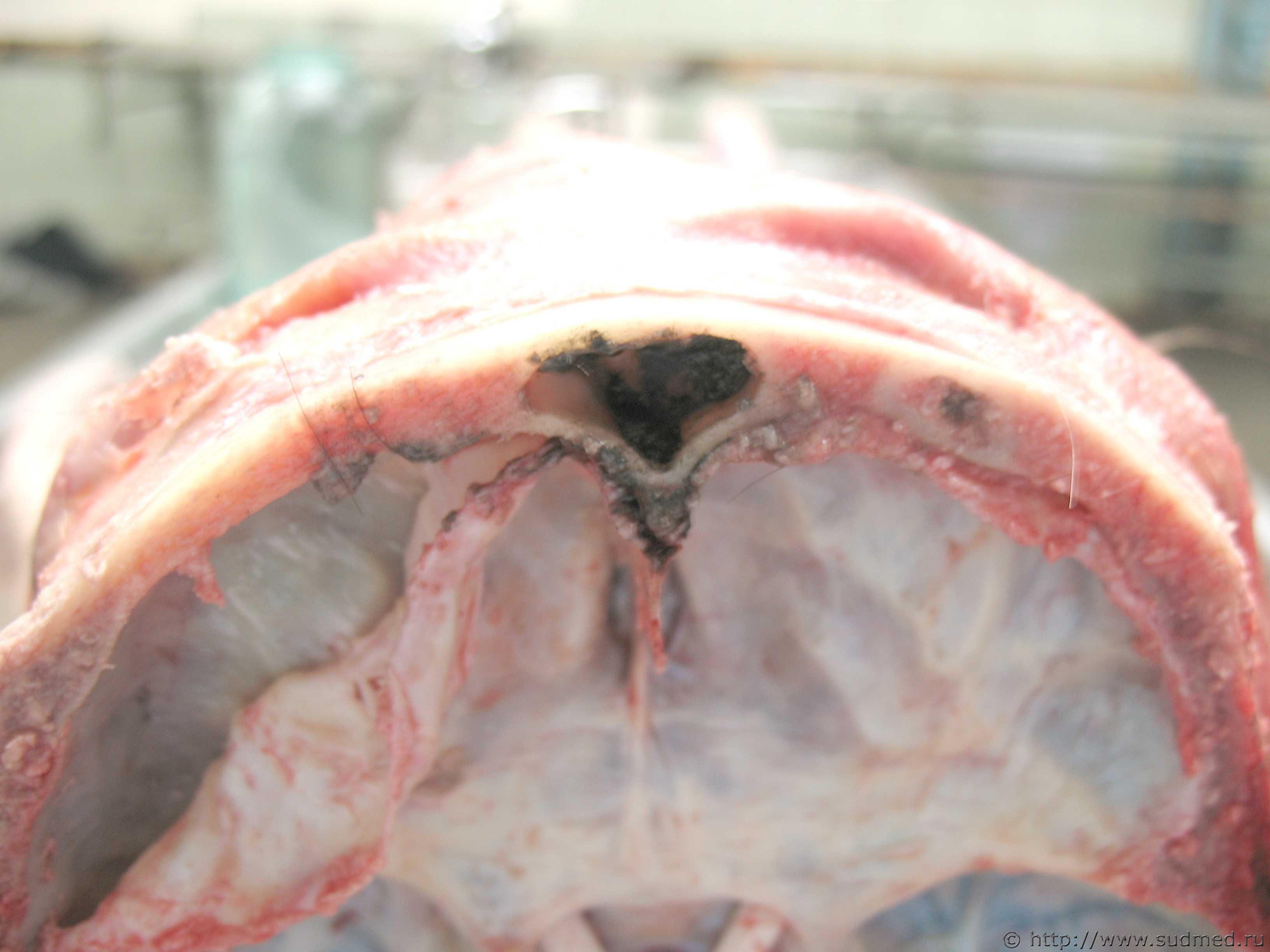 Никогда не думал, что такое можно еще встретить: огромные камни почек и как следствие, гнойный пиелонефрит, скорее пионефроз (из правой почки 600 мл гноя откачал) и уросепсис. ![]() ![]() Отравление угарным газом. Помарки копоти в передней черепной ямке, на внутренней поверхности продырявленной пластинки решетчатой кости. ![]() |